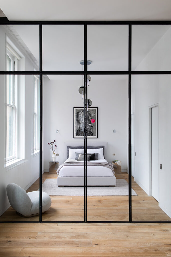 Ce loft est à l’avenant, situé dans un bâtiment historique du milieu du XIXe siècle. L’architecture intérieure, haut de plafond et en étain vert-de-gris antique, se distingue par ses trois belles colonnes corinthiennes. Pour matérialiser ses souvenirs selon ses goûts, Andrea Leung a supprimé la mezzanine exiguë lors des travaux et a réorganisé les pièces privées afin de créer un espace aéré avec un cabinet de curiosités. « C’est un regard sur l’espace brut », souligne l’architecte « Je savais exactement le genre de refuge que je voulais. Celui qui se déploie et se révèle lentement, qui vous impressionne par sa grandeur et capitalise sur votre curiosité. » L’entrée fait ainsi place à un salon et à une salle à manger, donnant l’impression d’une seule pièce, jusqu’à l’ouverture des portes coulissantes du long mur continu qui passe d’une face en miroir à une autre en verre. Derrière, se cachent une chambre, un dressing, une cuisine et deux salles de bains. L’interaction brouille ainsi les frontières entre intérieur et extérieur, quand les surfaces réfléchissantes et les espaces dissimulés transcendent les limites physiques d’un loft baigné de lumière.