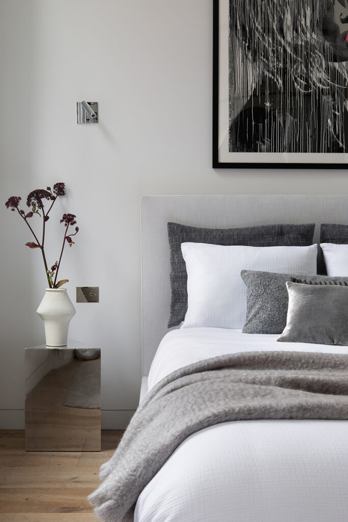 Apaisant. Côté salon, la chambre borde la rangée de fenêtres et bénéficie pleinement de la lumière. La toile Bubble Gum Girl est signée Hijack. Lustre Eclipse (Lee Broom), chaise lounge Pacha (Pierre Paulin).