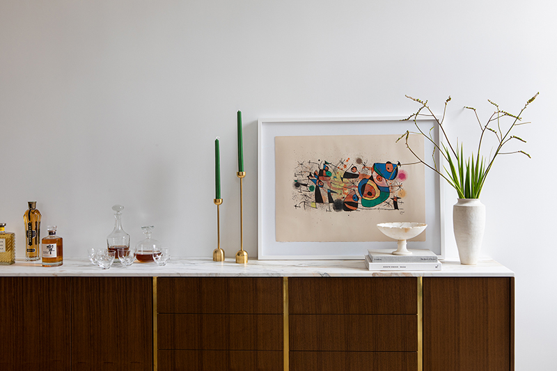 Raffiné. La console en laiton et noyer est également créée sur mesure par Andrea Leung qui fait jouer les concepts d’équilibre et de soutien avec les plateaux, les pieds et les portes de forme irrégulière.