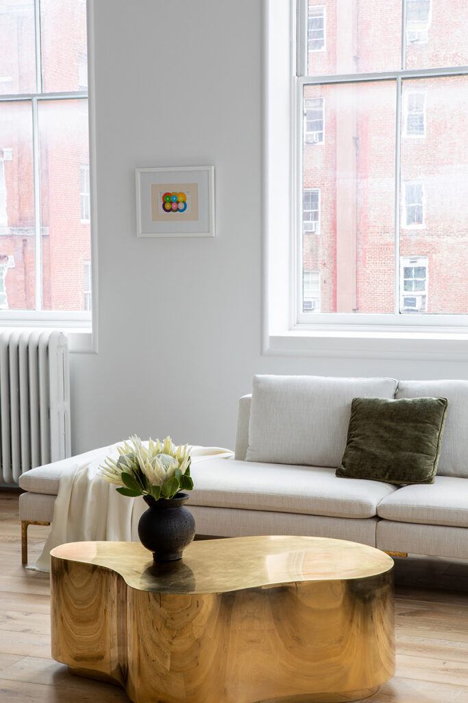 So chic. Dans le salon, la table basse en laiton d’Andrea Leung (Steven Harris Architects) pour Barneys New York s’harmonise avec l’Arch Bench de Pietro Franceschini qui prête ses courbes organiques à l’aspect rectiligne.