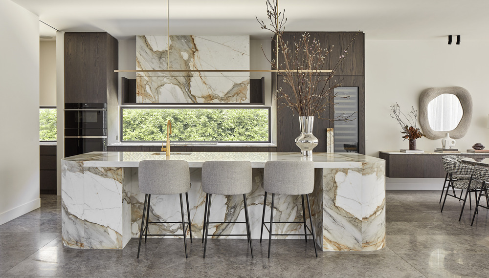 Îlot de cuisine central en marbre Calacatta Oro, parfait pour les rencontres informelles.