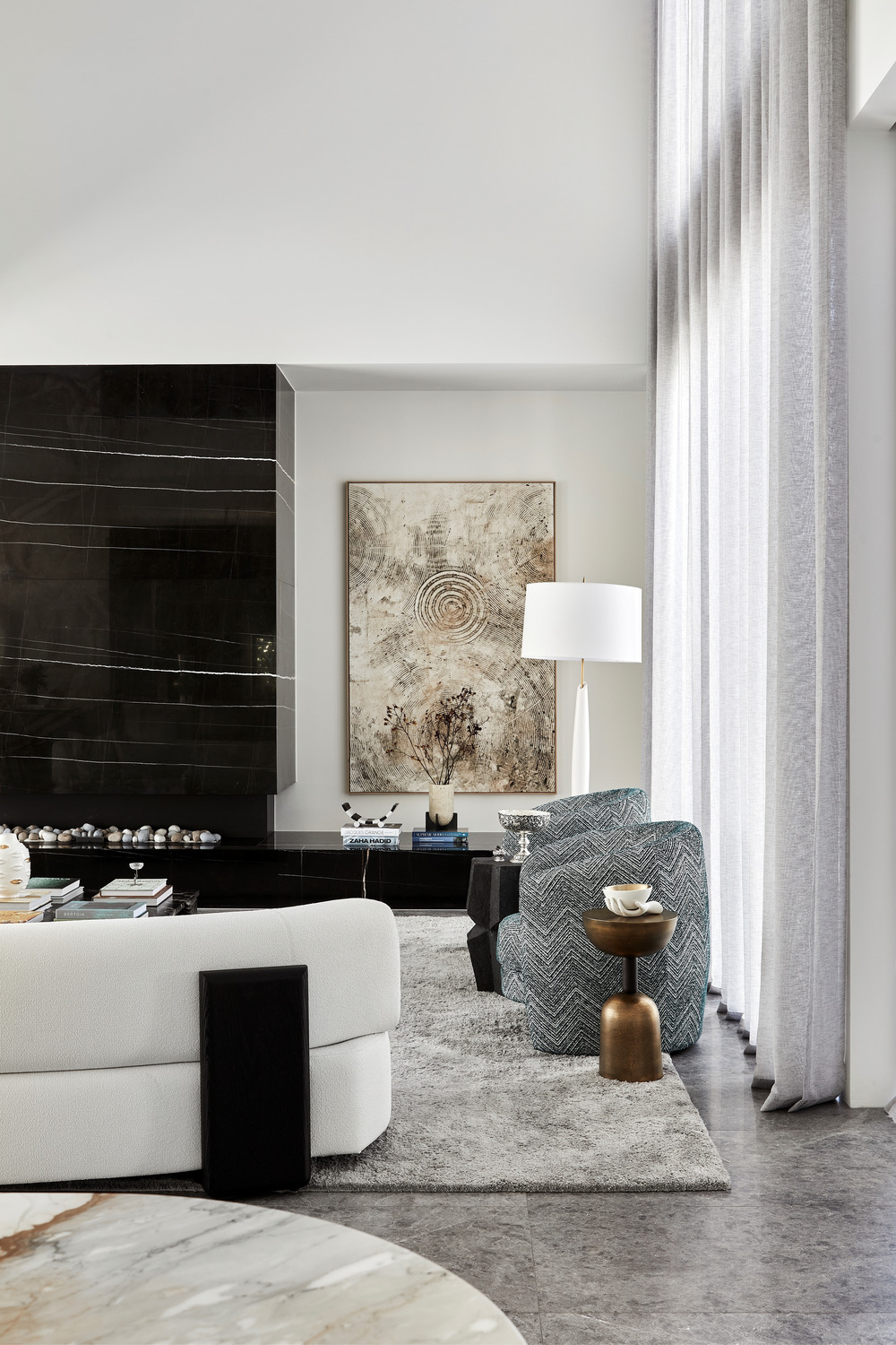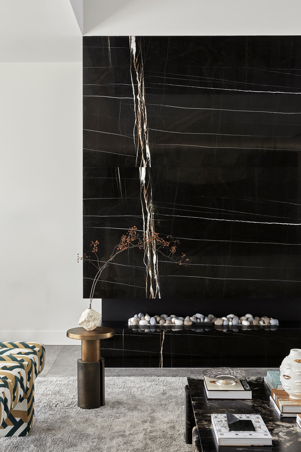 La cheminée Realflame Pure Vision parée de pierre noire veinée, crée un contraste saisissant avec les surfaces en marbre clair.