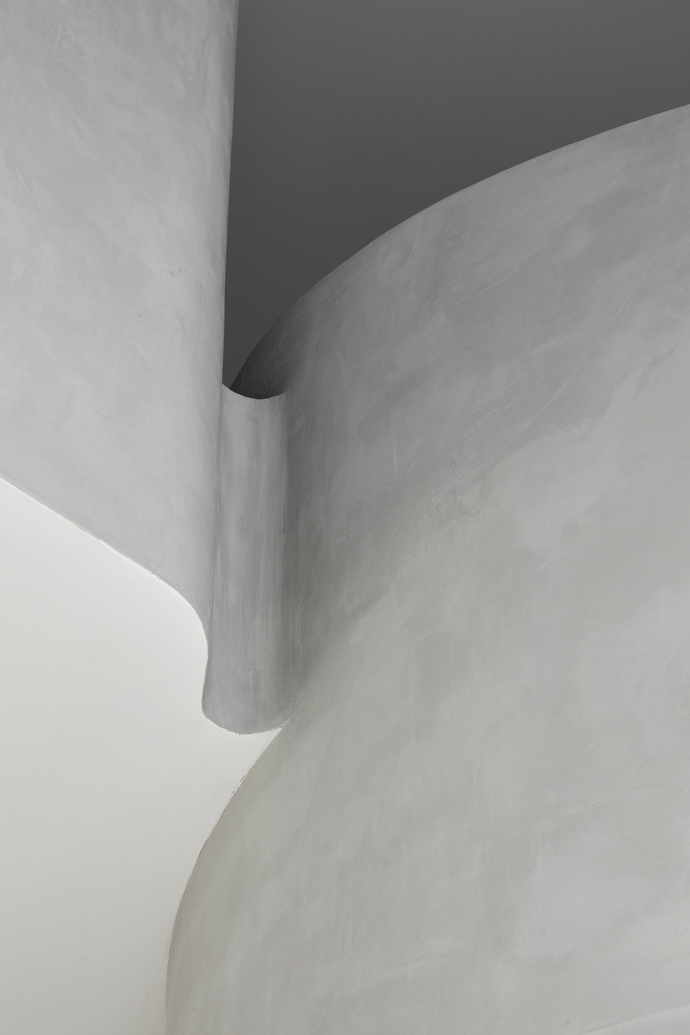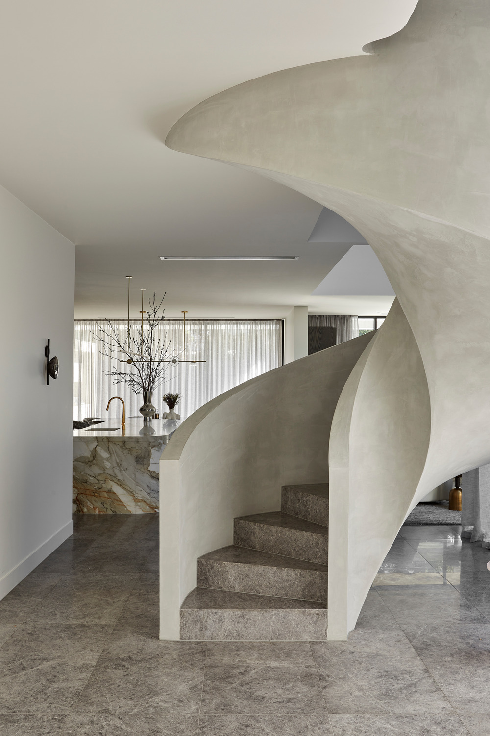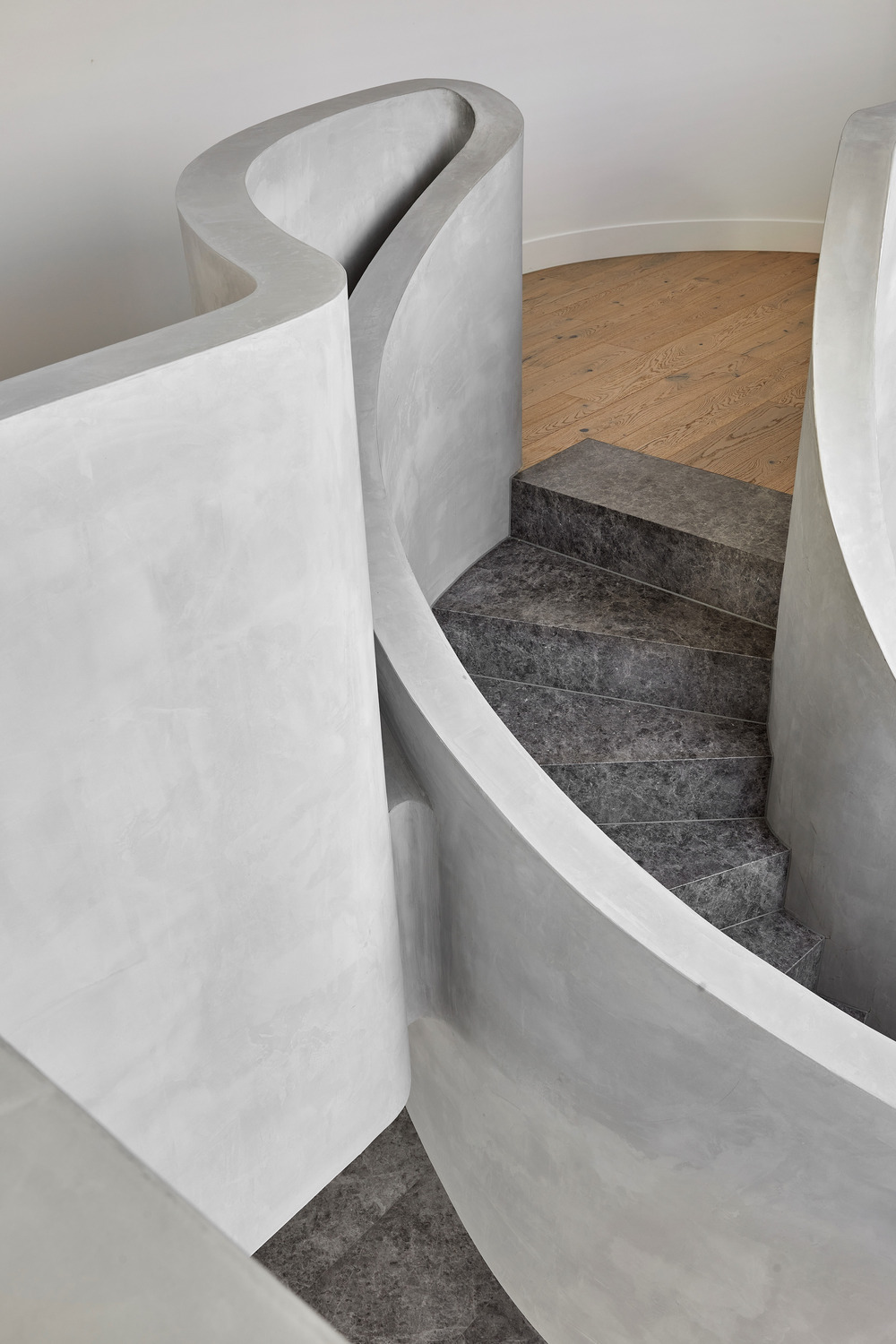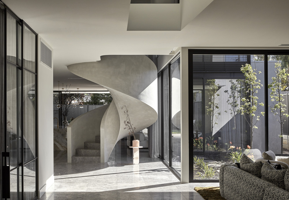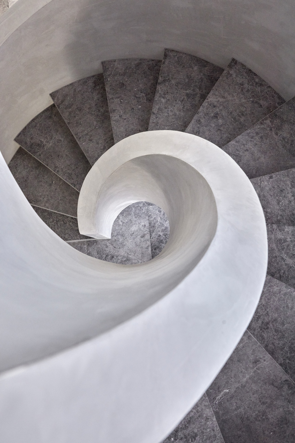 L’escalier hélicoïdal en béton poli demeure sans conteste le point focal de l’habitation.
