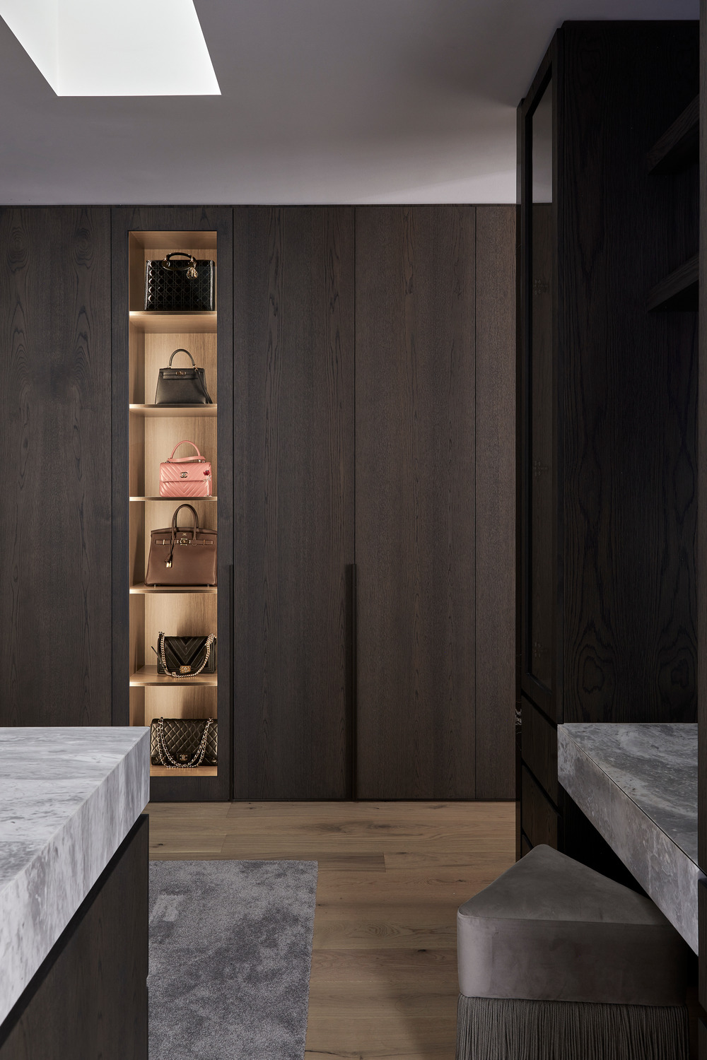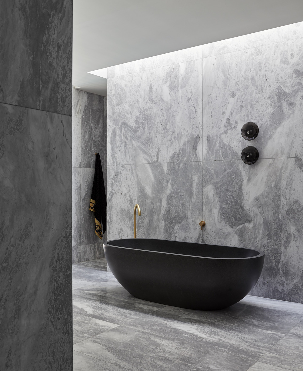 La palette de matériaux participe pleinement à cette sensation de calme maîtrisé. Le béton poli côtoie des enduits minéraux doux, tandis que les menuiseries en bois de noyer réchauffent l’ensemble. La pierre naturelle occupe une place de choix : le marbre Calacatta Oro apporte profondeur et élégance à la cuisine, tandis que le marbre Grey Tundra, à la finition veloutée, habille plans de travail et sols dans une sobriété en parfaite résonance avec l’esthétique magistrale de la maison.