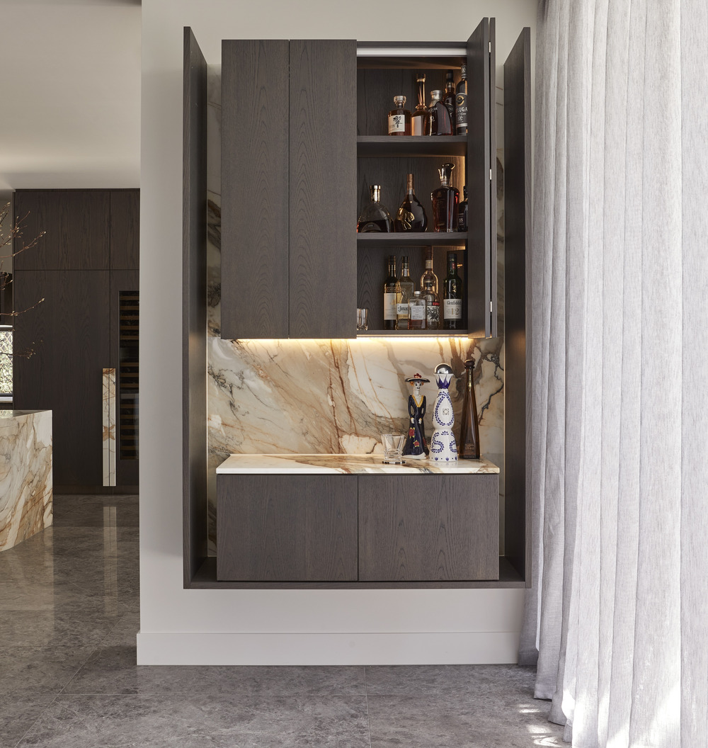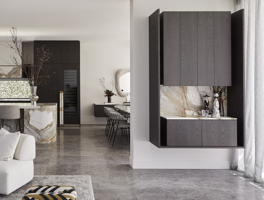 Dans la cuisine, les plans de travail et sols en marbre Grey Tundra Honed créent une harmonie minérale raffinée.