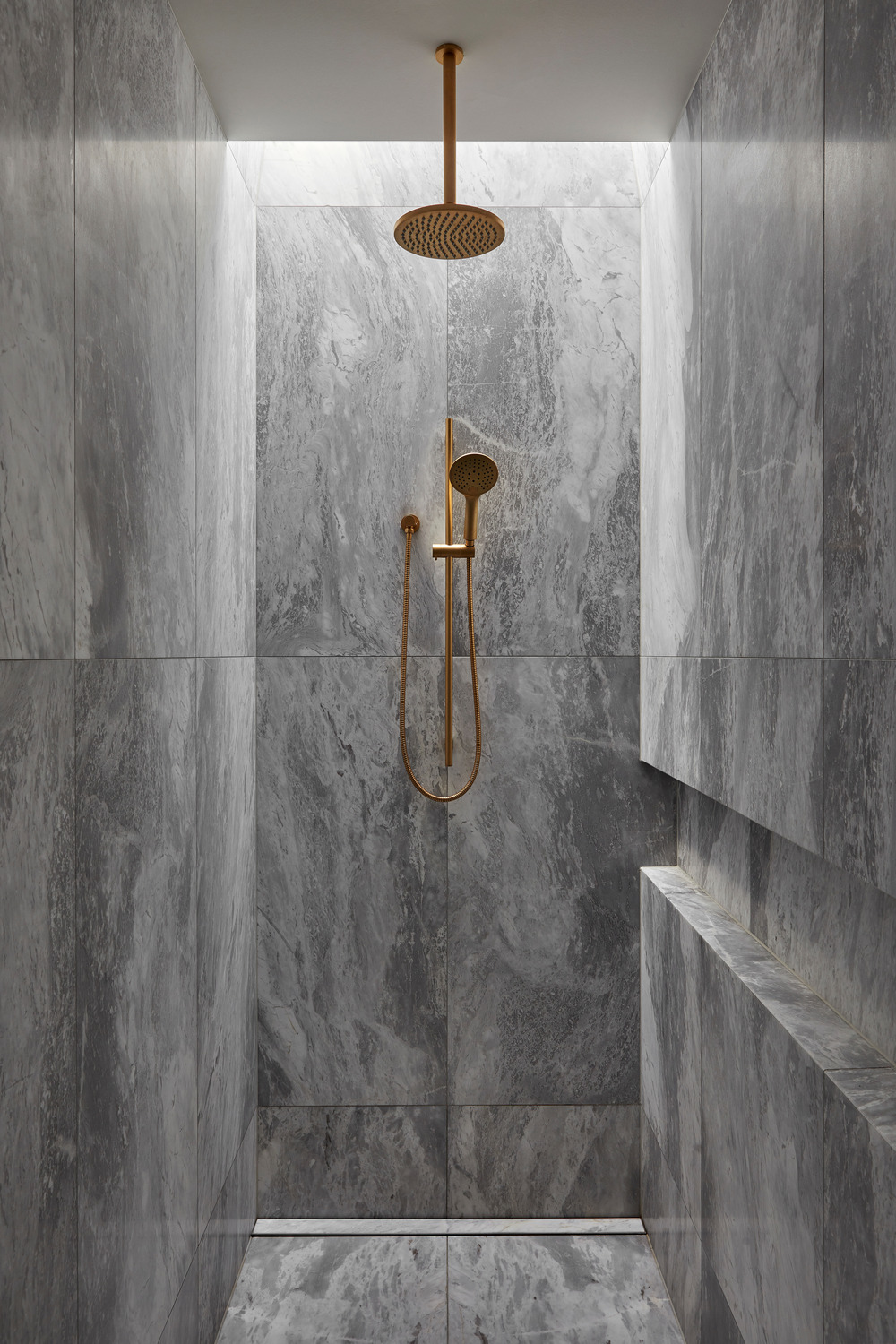 La douche en pierre grise, dont les volutes claires apportent douceur, est sublimée par une robinetterie en finition or brossé.