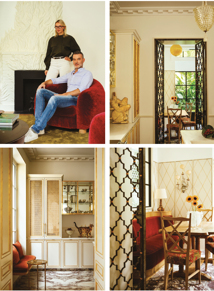Répartie sur quatre niveaux et 350 m2, avec un jardin tropical de 150 m2 en contrepoint, la demeure a été pensée comme une résidence principale raffinée et chaleureuse. Pour Hugo Marchand, codirecteur artistique de la maison Christian Louboutin et heureux acquéreur des lieux, tout faisait sens : les volumes étaient là, la hauteur sous plafond, les possibilités d’extension… Mais il manquait une vision pour les intérieurs. Cette vision, il l’a trouvée en Laure Gravier, cofondatrice de Claves, rencontrée lors d’un dîner. Entre eux, une passion commune : les arts décoratifs français, notamment ceux des années trente et quarante. Le projet s’est construit pièce à pièce, autour d’objets patiemment réunis par le propriétaire. La grille en fer forgé signée Gilbert Poillerat a donné le ton : son motif en croisillons se décline aujourd’hui sur les cache-radiateurs, les placards, jusque dans le jardin d’hiver. Un fil conducteur affirmé, qui structure l’ensemble avec cohérence.