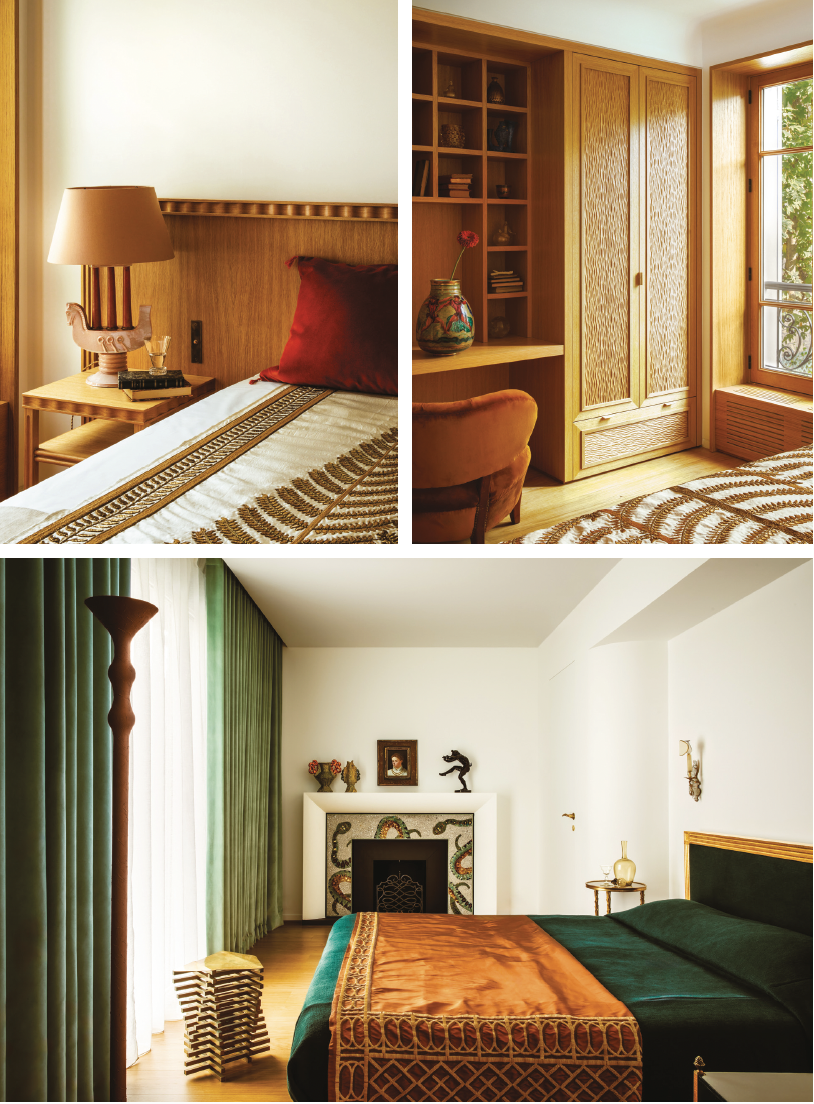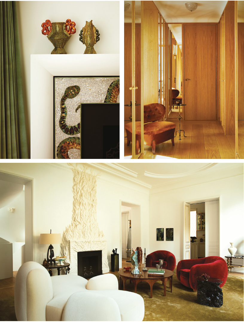 Les artisans se sont placés au coeur du récit : boiseries en chêne sculpté réalisées par la Maison Chabot, salles de bains en travertin Osso et Cipollino verde par Mineral Expertise, ornements des cheminées par Staff Espace Volumes. Habitué à s’appuyer sur le savoir-faire artisanal pour la confection de souliers, Hugo Marchand a retrouvé ce plaisir du détail, à une tout autre échelle. Et si le raffinement est omniprésent, l’esprit des lieux reste résolument tourné vers la vie. « Ce n’est pas une maison d’apparat », précise le propriétaire. On y cuisine, on y reçoit, les cheminées crépitent, les chats circulent, les amis séjournent. Une intimité habitée, où le mobilier et les oeuvres d’art conversent tels de vieux complices : chauffeuses Otto Schulz, appliques Poillerat, mosaïque viennoise conçue avec Delphine Messmer, céramiques de Jean Mayodon… Le moindre élément devient le témoin d’un passé réinventé. Au-delà de sa beauté, la demeure possède une âme. Et c’est sans doute là que réside la force de Claves : dans cette capacité à composer un décor qui n’en est pas un, un intérieur qui se ressent autant qu’il se regarde.