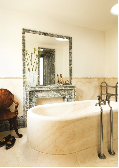 Minéraux. Le travertin Osso et Cipollino verde de Mineral Expertise confèrent une profondeur texturée aux pièces d’eau.