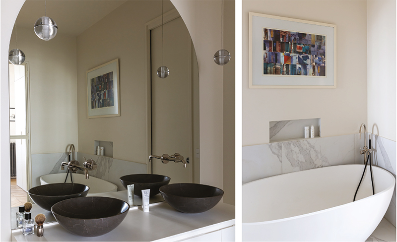 Dans ce logement situé au premier étage, l’éclairage devait être performant. Ici, la suspension Bocci 14, des boules de verre moulées à la main.