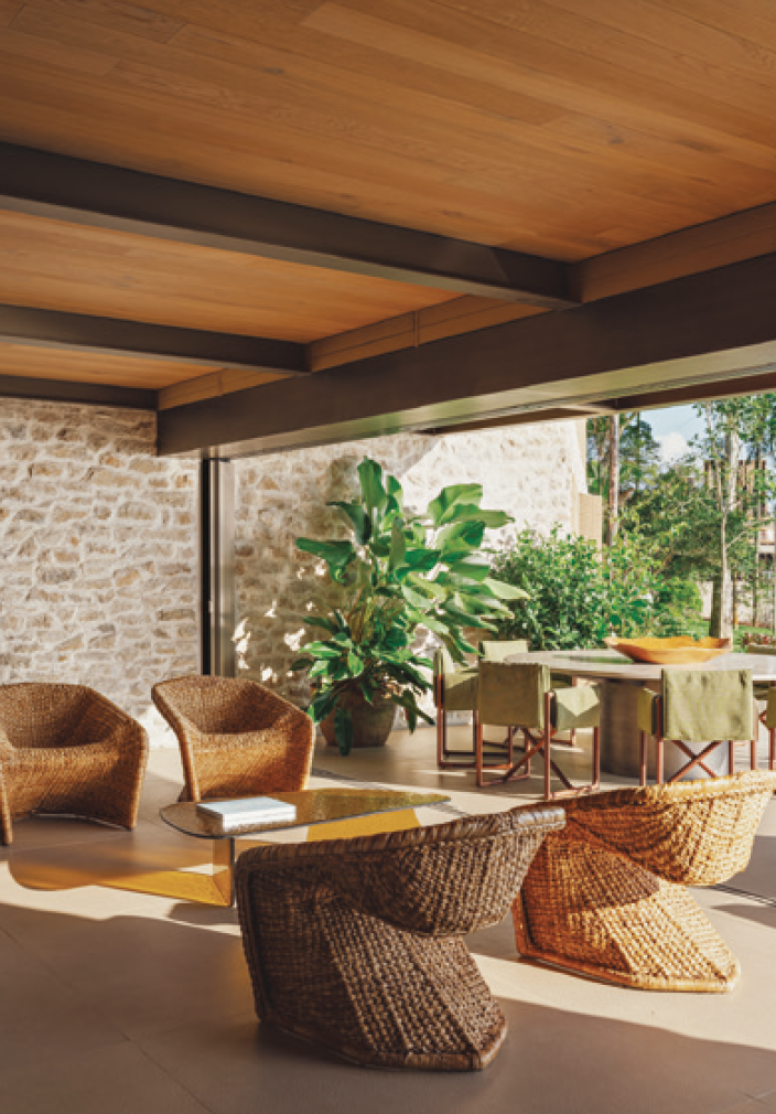 Détente L’espace de vie se distingue par ses larges baies vitrées et un mobilier alliant confort et légèreté.Les fauteuils Vidigal de Lattoog, icône du design brésilien actuel, instaurent une atmosphère décontractée.