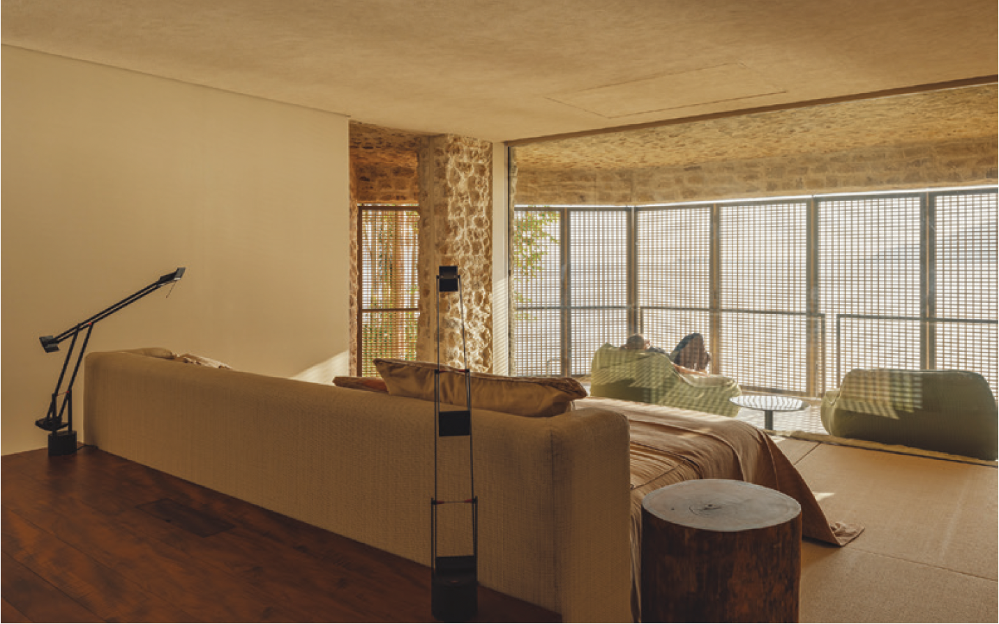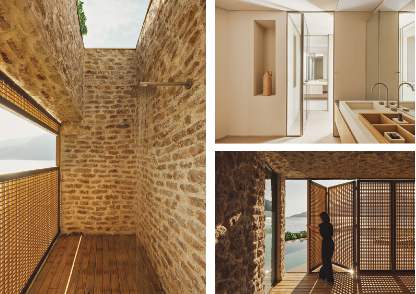 Épuré. Dans la salle de bains parentale, pierre brute et lumière naturelle tissent une atmosphère de bien-être. Tamisé. Les moucharabiehs en bois Accoya préservent à la fois l’intimité et la connexion avec l’extérieur.