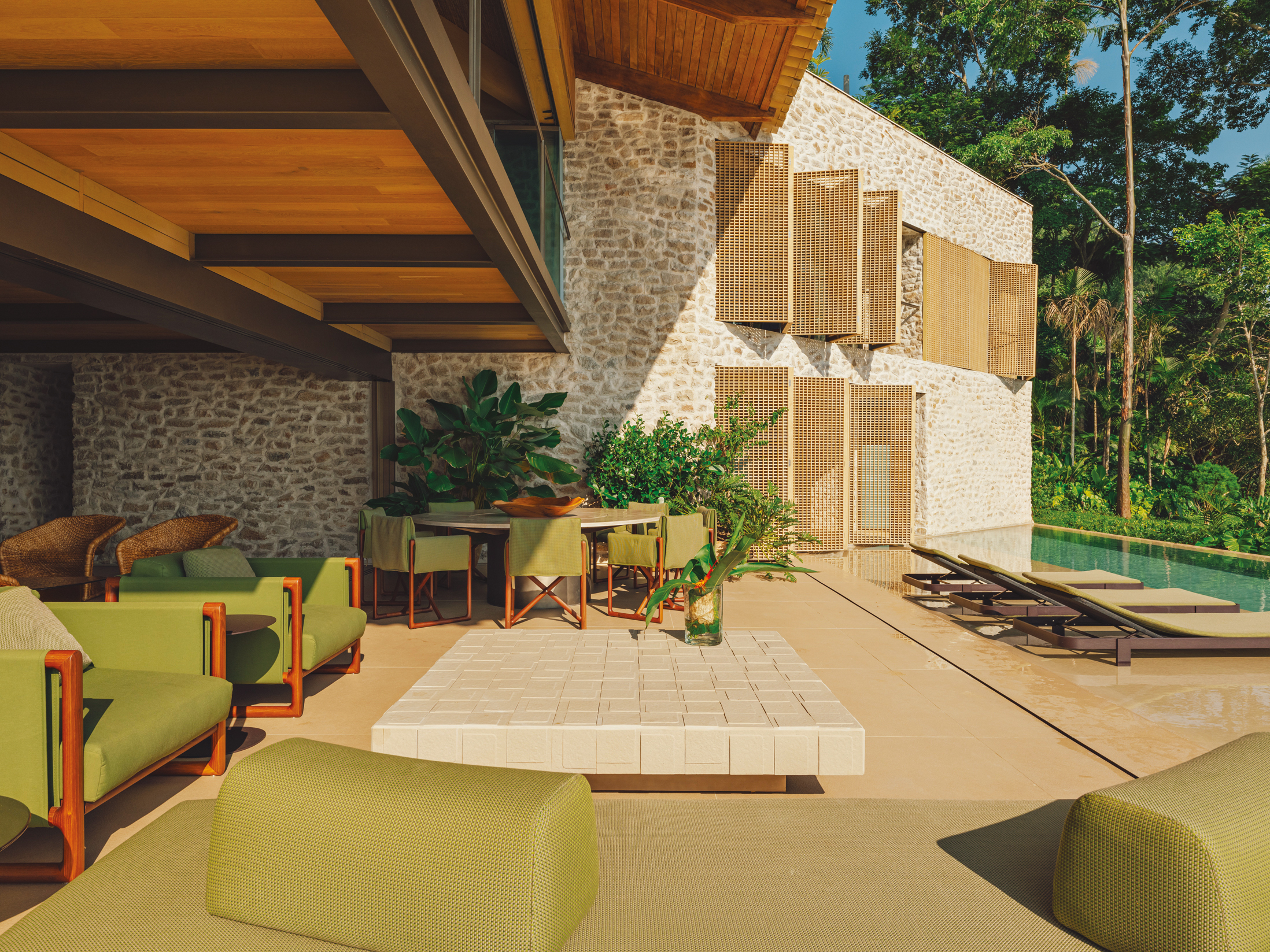 Énergie Autour de la piscine, les lignes colorées du canapé Orlando et des chaises longues Rams de Paola Lenti. Création La table basse Vieira Souto d’Arthur Casas traduit l’élégance discrète des lignes modernistes