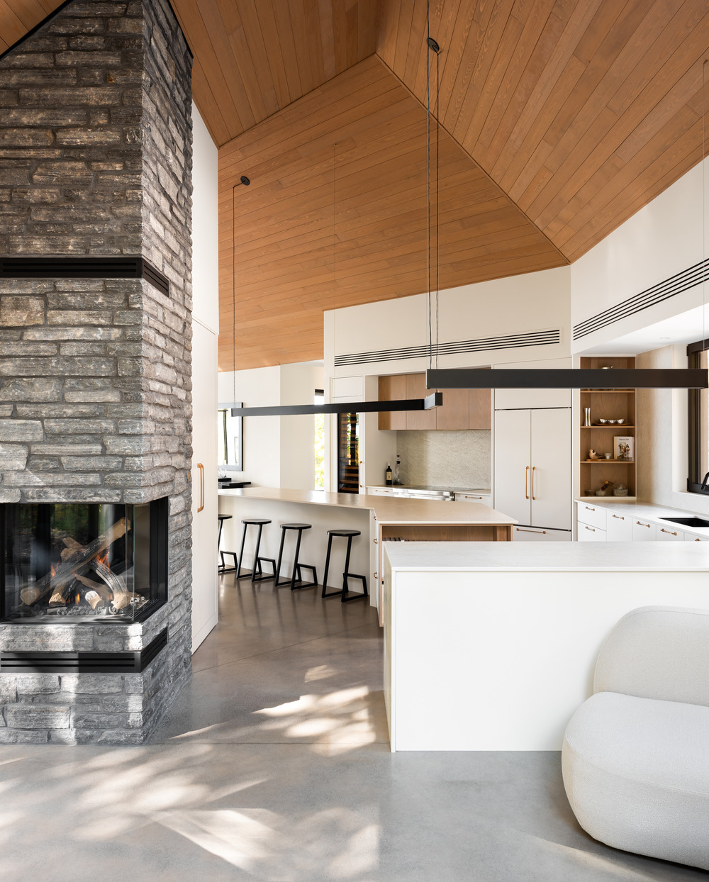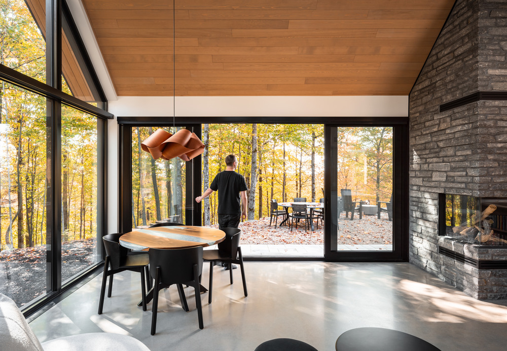 Attirant d’emblée les regards, la majestueuse cheminée en pierre se marie avec le bois clair pour rappeler les textures et nuances des Laurentides. Orienté plein sud, le jardin d’hiver invite à la détente tout en déployant une vue dégagée sur la nature. Ses larges ouvertures permettent au soleil d’inonder le foyer de lumière et de chaleur, renforçant le lien entre dedans-dehors. Ici, tout semble trouver sa place, comme si la maison avait toujours appartenu au paysage.