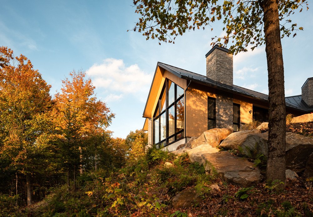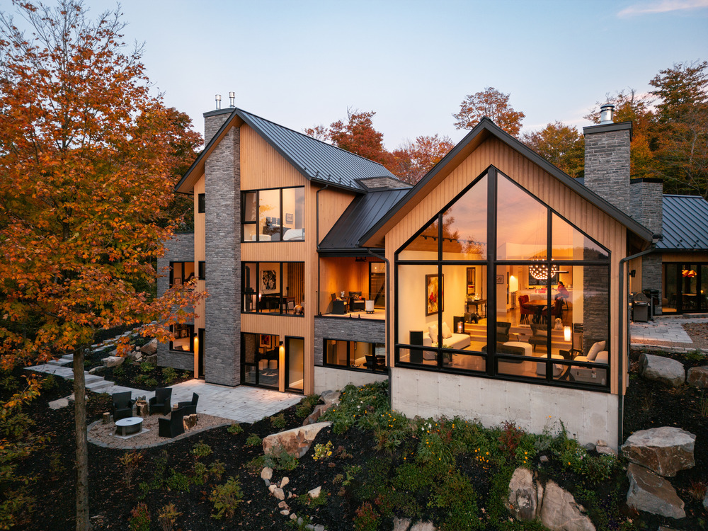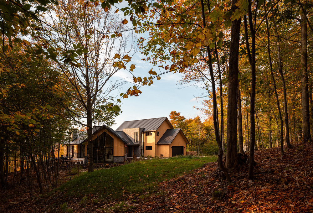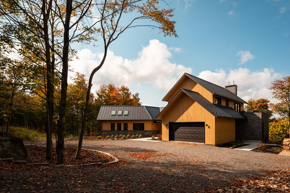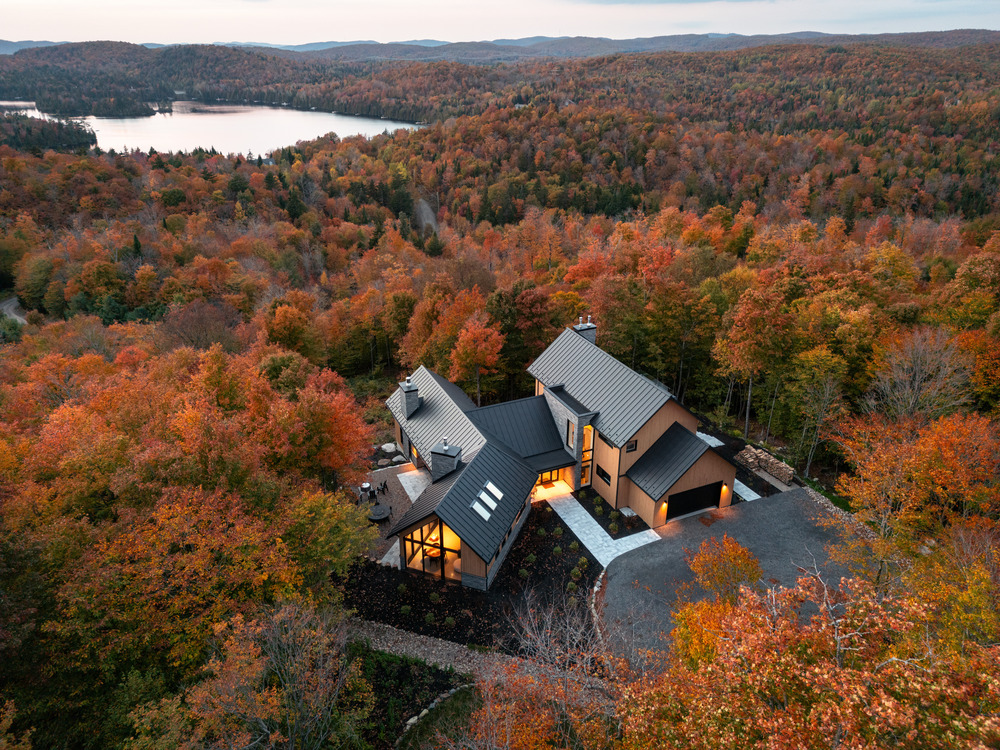 Dans la splendeur des Laurentides, à quelques pas du lac Saint-Victor au Québec, cette résidence intergénérationnelle mêle classicisme et modernité, en combinant lignes épurées et structure en pignon.