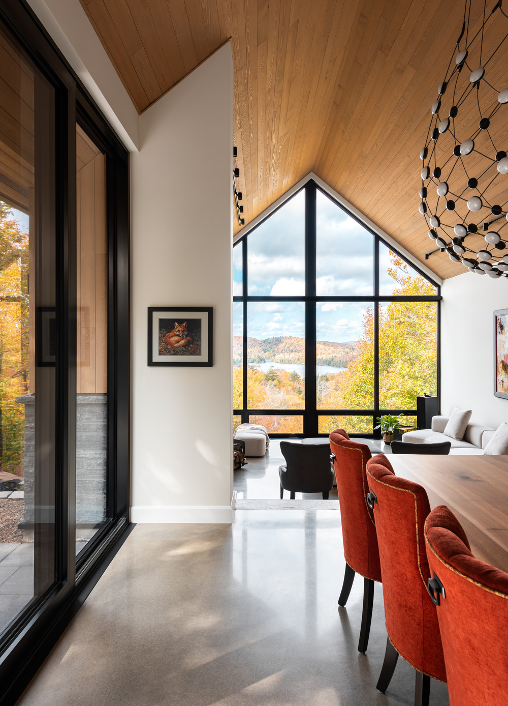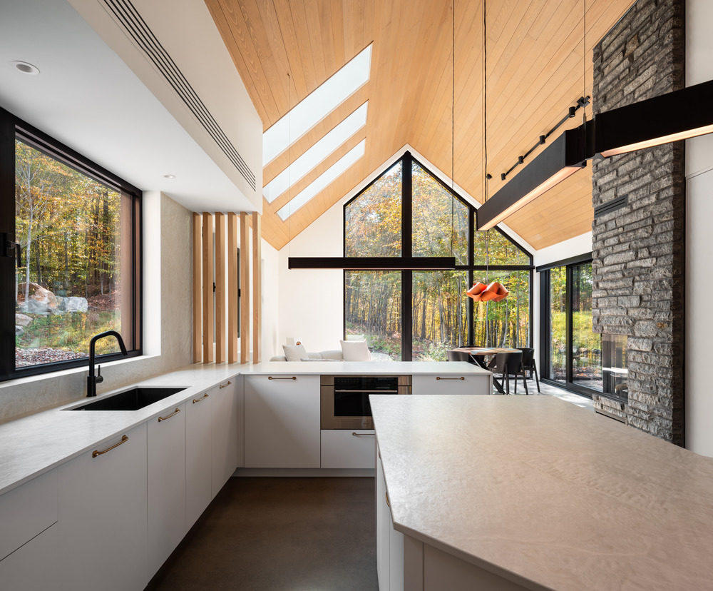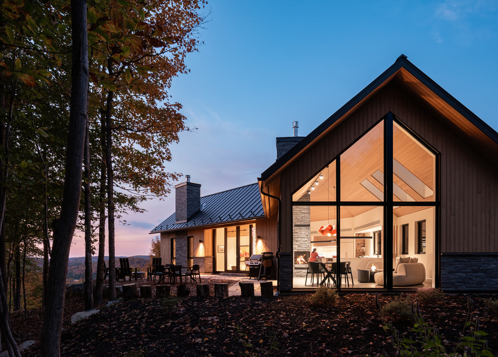 Dans la splendeur des Laurentides, à quelques pas du lac Saint-Victor au Québec, cette résidence intergénérationnelle mêle classicisme et modernité, en combinant lignes épurées et structure en pignon.