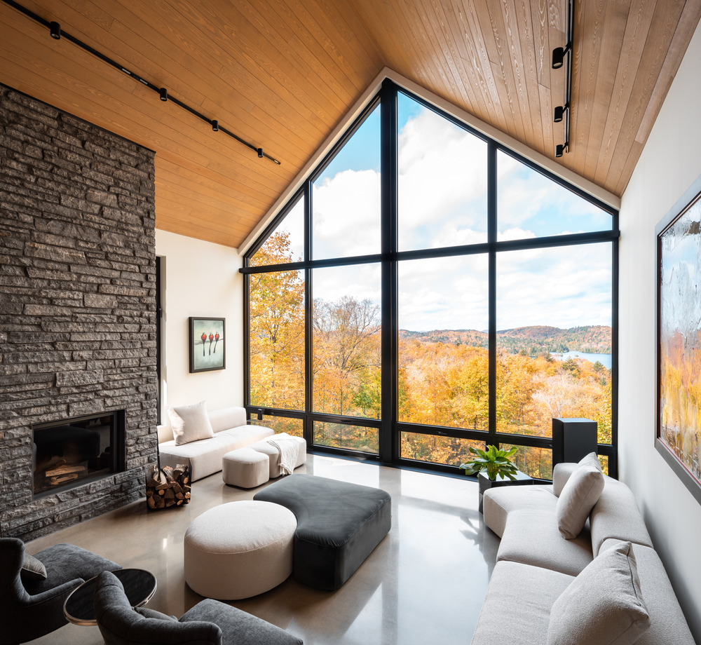 Attirant d’emblée les regards, la majestueuse cheminée en pierre se marie avec le bois clair pour rappeler les textures et nuances des Laurentides. Orienté plein sud, le jardin d’hiver invite à la détente tout en déployant une vue dégagée sur la nature. Ses larges ouvertures permettent au soleil d’inonder le foyer de lumière et de chaleur, renforçant le lien entre dedans-dehors. Ici, tout semble trouver sa place, comme si la maison avait toujours appartenu au paysage.