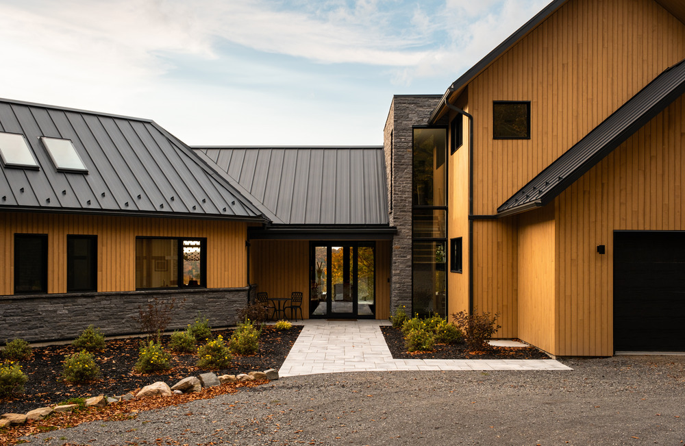 Le toit en métal noir aux lignes nettes contraste avec les tons naturels de la façade, ajoutant une touche contemporaine.