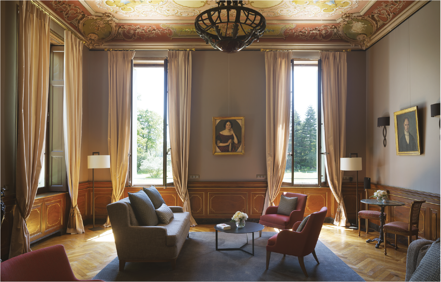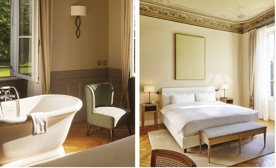 NOBLESSE. Instant de volupté avec les baignoires rétro, posées sur les parquets à chevrons. La décoration des chambres et suites rend hommage à l’histoire des lieux. TRAIT D’UNION. Dans le salon, les oeuvres et le mobilier d’.poque tissent un lien entre passé et présent.