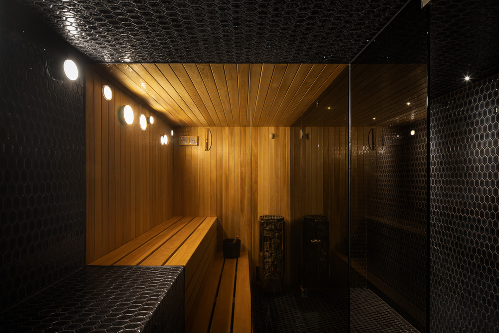 À l’intérieur, se marie avec harmonie une variété de matériaux naturels, tels que le chêne, le noyer, la pierre, le marbre et le bois brûlé Shou Sugi Ban.