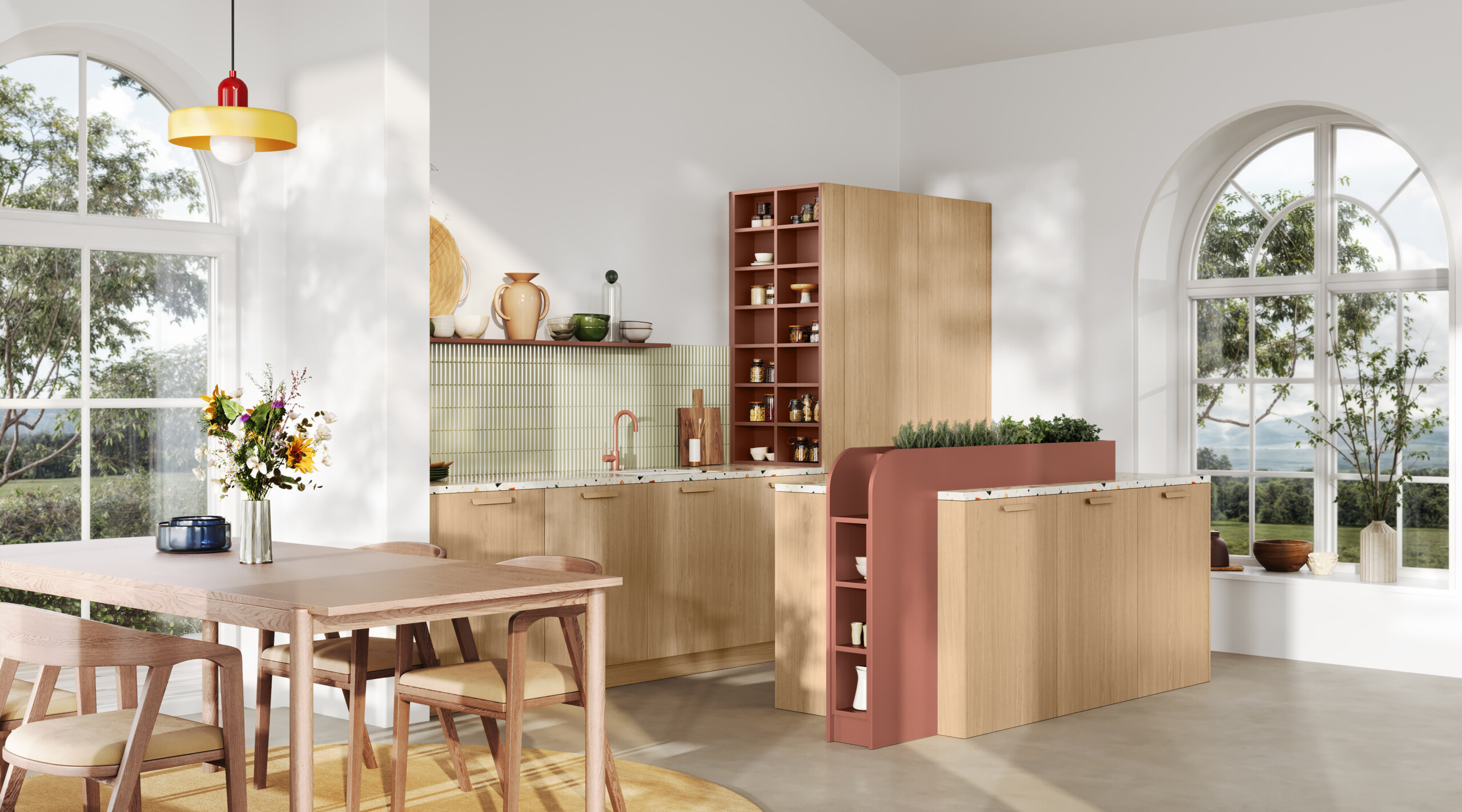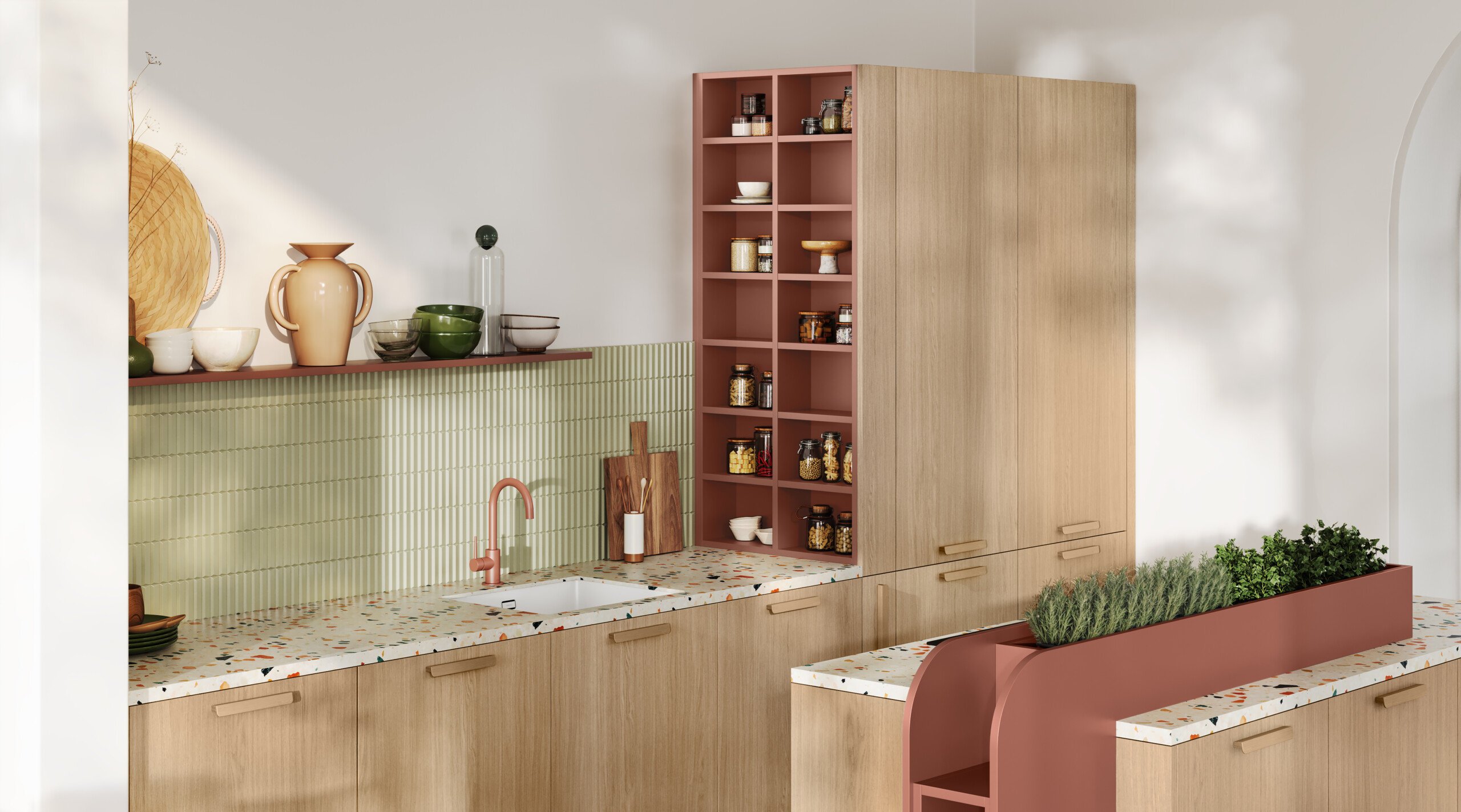 Pour faciliter un mode de vie plus éco-responsable, Fleurs est aménagée avec une jardinière d’intérieur et une “bocothèque”, encourageant les utilisateurs à faire pousser leurs aromates dans la cuisine et à adopter la pratique du vrac.