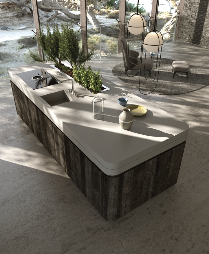 Écosystème. Oasi chez Aran Cucine arbore un citronnier planté dans un pot central avec système d’irrigation intégré. Plan de travail en Corian. Façades en bois récupéré (pieux de bois de Venise). arancucine.it