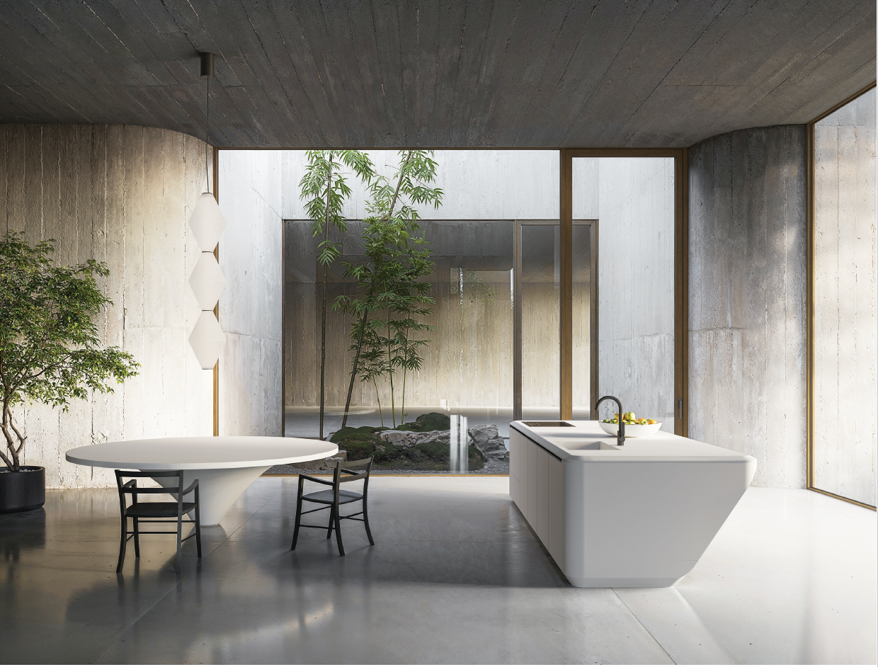 Avant-garde. Cove de Zaha Hadid pour Boffi. Cuisine et oeuvre d’art, ce monobloc se distingue par ses formes sinueuses et simples, réalisées avec des matériaux malléables tels le Corian ou le bois. boffi.com