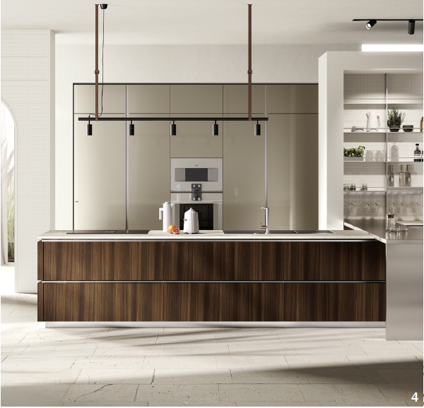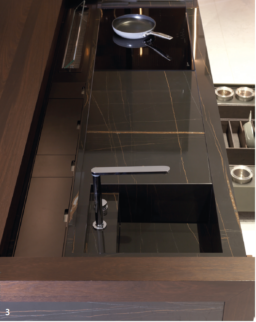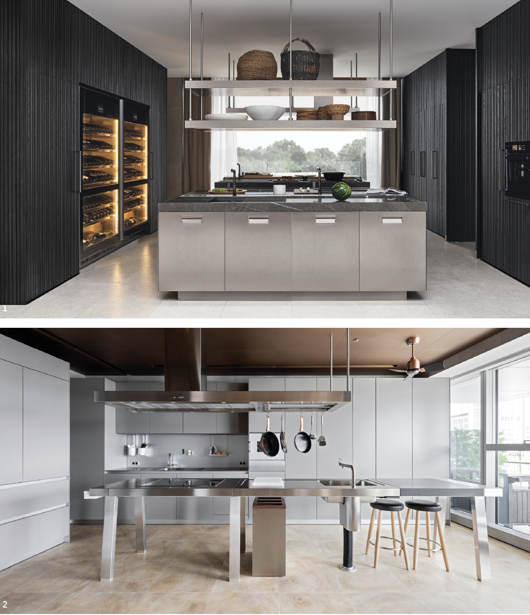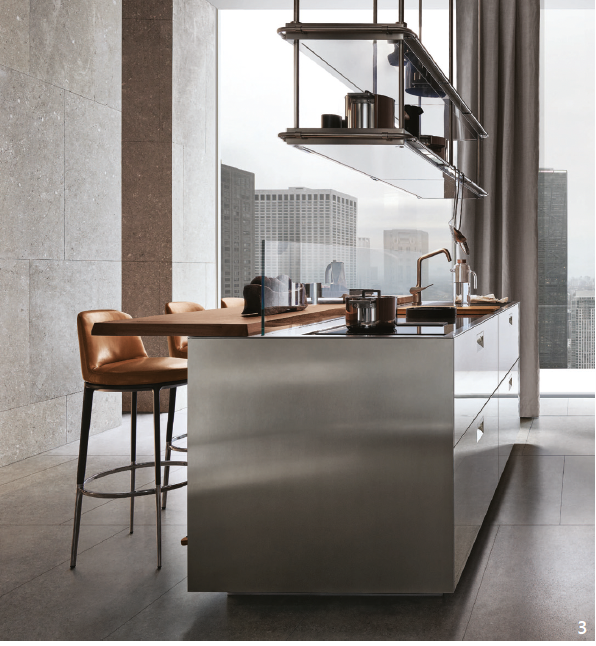 3 Avant-garde. De l’acier à la hotte suspendue : dès ses débuts, la cuisine Italia d’Antonio Citterio pour Arclinea a adopté l’esthétique et les solutions techniques des équipements professionnels. arclinea.com 4 Élégance. Mira de Vuesse pour Scavolini. Îlot avec portes en plaqué eucalyptus. Laqué brillant effet nacré. Plan de cuisine et îlot en quartzite Taj Mahal et coin petit-déjeuner en inox. scavolini.com