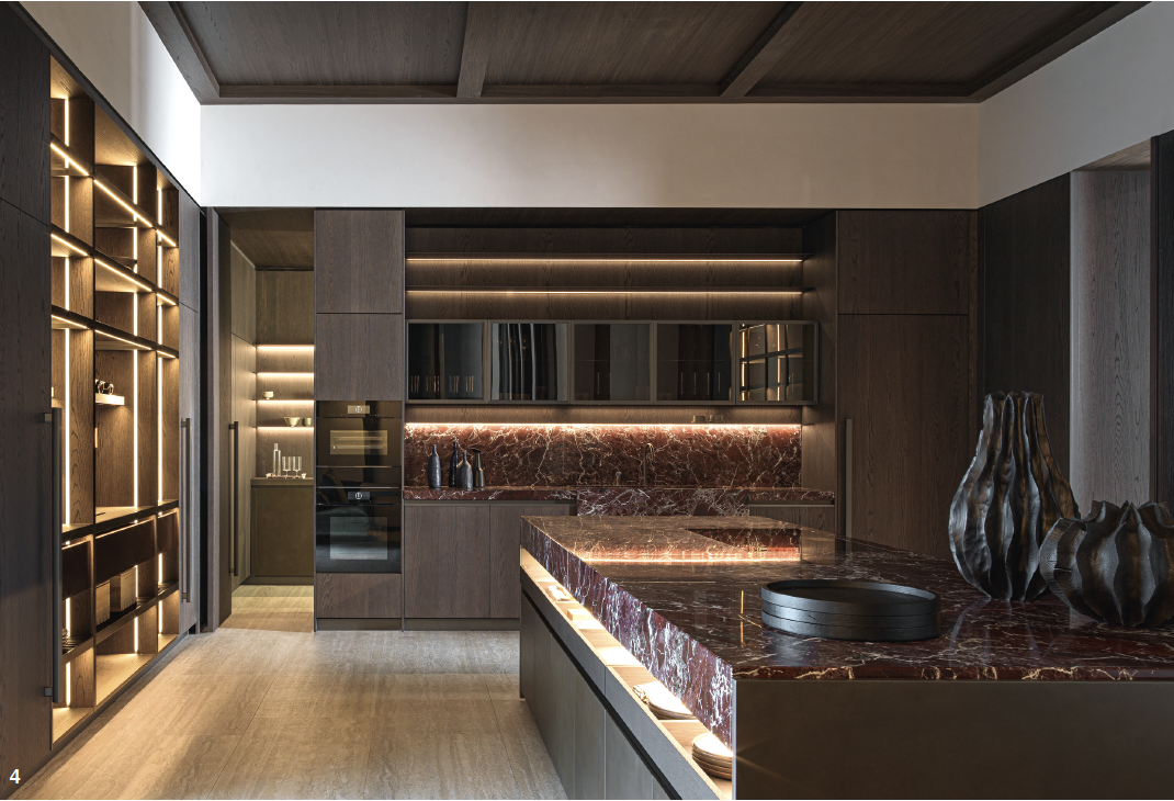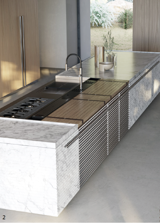 4 Nouveautés. La cuisine VVD de Molteni&C évolue : plan de travail en marbre de 150 mm d’épaisseur, éclairage Led 2700 K à intensité variable, nouvelle porte PT40 avec ouverture pivotante à 180°. molteni.it