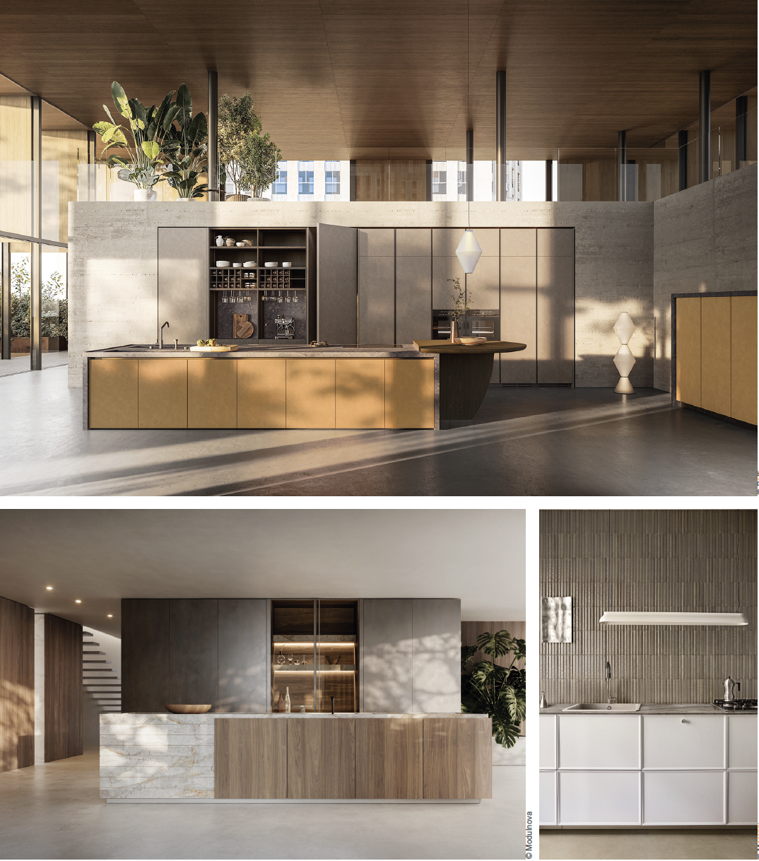 Novateur. XO chez Boffi. Une saillie de 3 cm encadre les portes iconiques sans poignées qui, pour la première fois, effleurent le sol à seulement 2 cm. Plan en quartzite Breccia Imperiale. boffi.com Cohérence. Art chez Modulnova. Le volume en grès imitation marbre des Apennins dialogue avec le bois huilé en noyer. L’éclairage intégré des étagères exalte les veines et les textures. modulnova.com Texture. Le carrelage Lume de Marazzi se décline en format 6 x 24 cm et de nouvelles teintes à l’allure hyper moderne et aux surfaces ultra brillantes. En grès cérame ici finition Greige poli. marazzi.fr