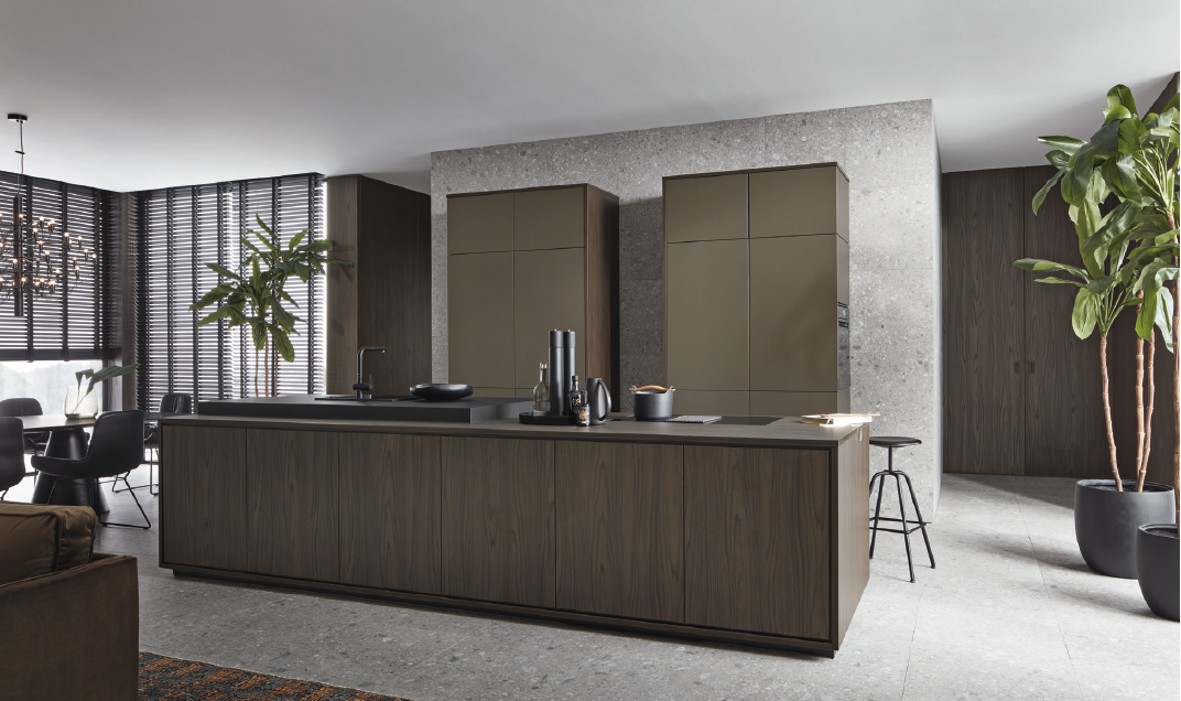 Noble. Façades NeoPure de Nolte en stratifié laqué finition métal bronze. Sous îlot, meuble NeoLeaf en bois Noce marone. Système sans poignée Matrix Zero (push to open). nolte-kuechen.com