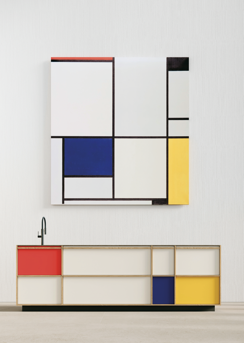 Clin d’oeil. Kyoto de Leicht s’inspire des tableaux de Piet Mondrian. Une grille graphique en chêne clair structure des champs de couleurs primaires, ajustés aux largeurs d’armoire. leicht.com