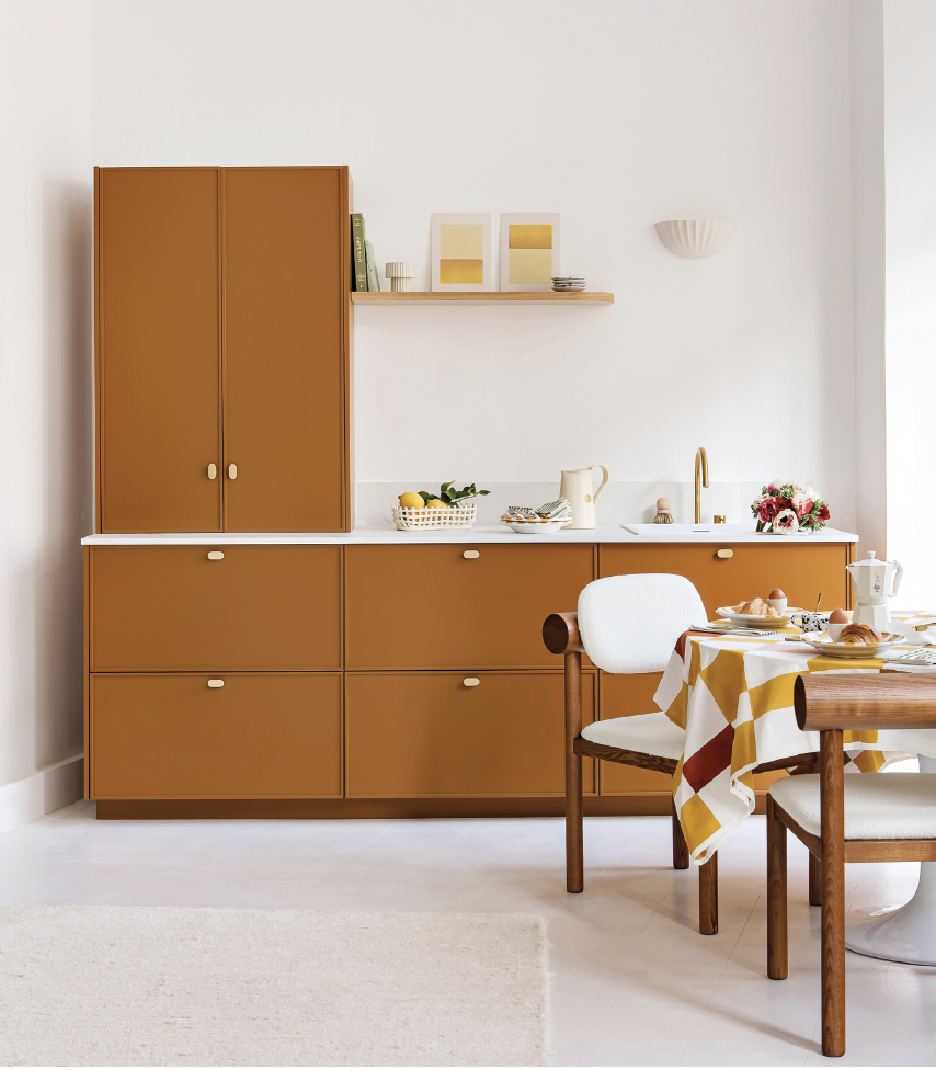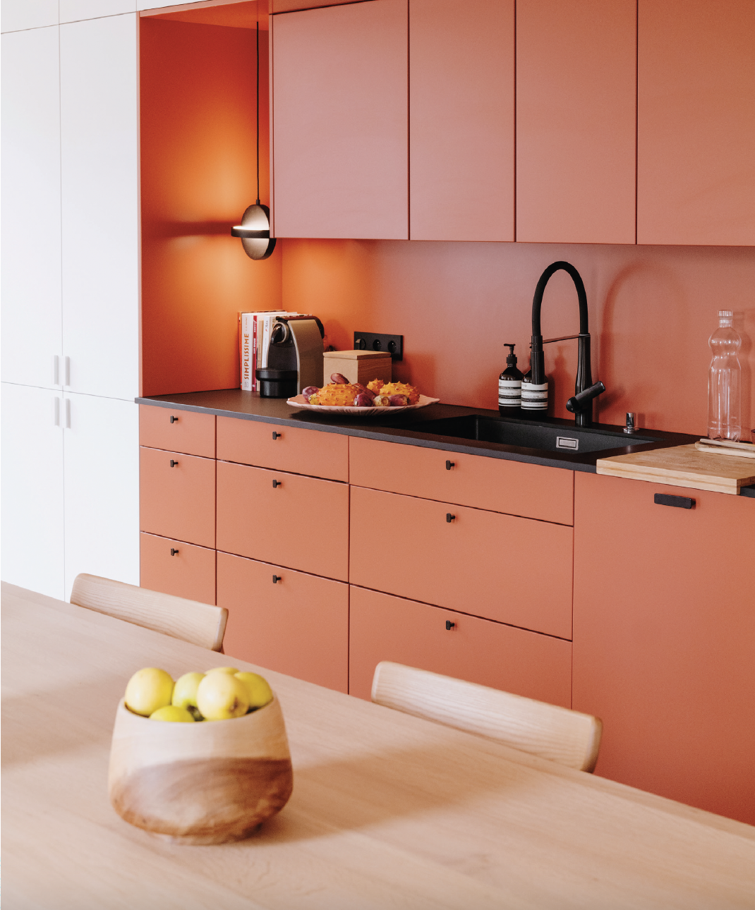 Composition. Implantation XXL sur un seul pan de mur pour cette réalisation Perene. Façades laquées coloris Sikkens terracotta associées au stratifié et Fenix blanc Kos. Plan de travail Fenix noir. perene.fr