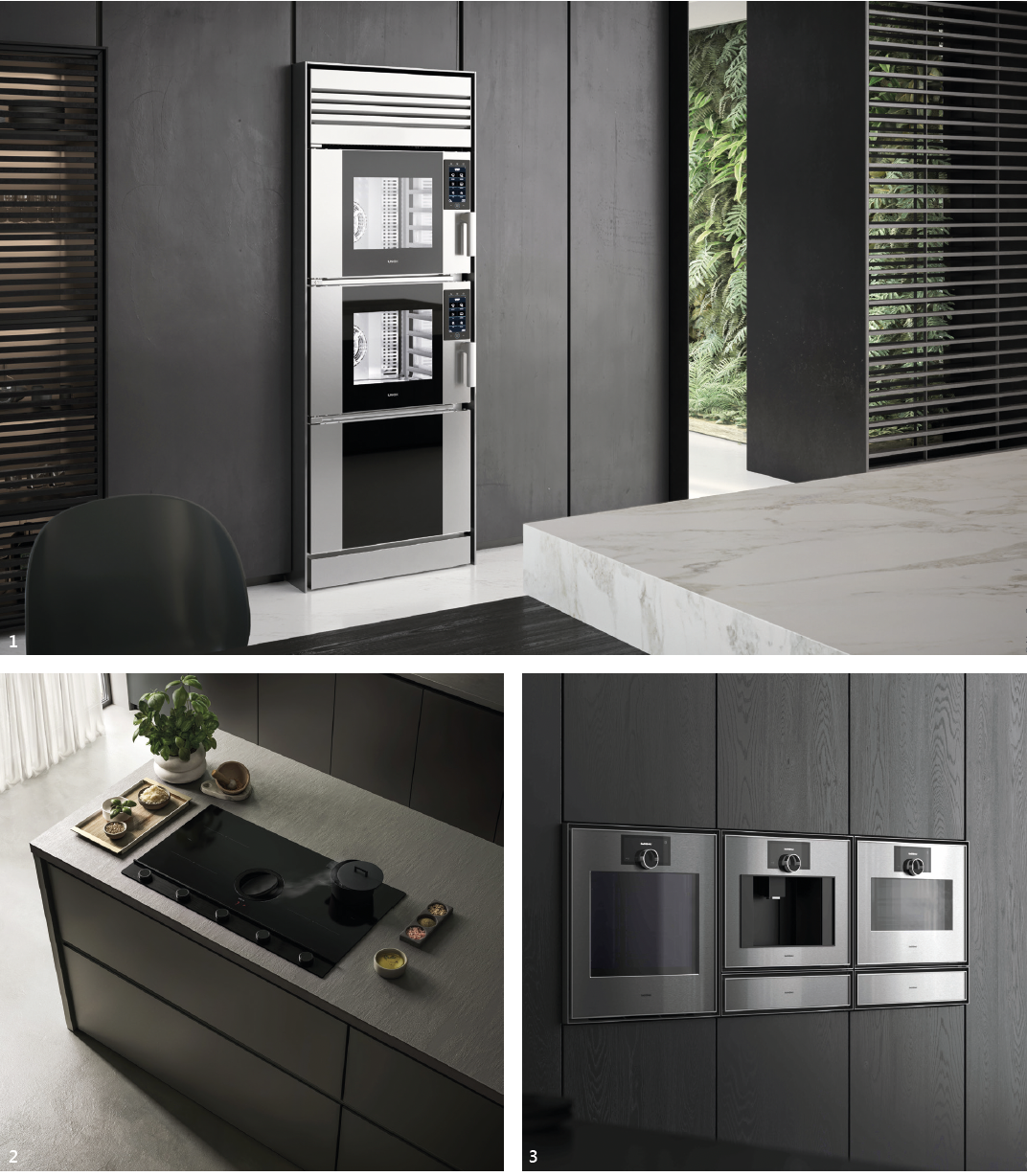 1 Intelligents. Fours Model 1 SuperOven chez Unox Casa. L’interface intuitive ouvre la voie à des méthodes de cuisson inédites, telles que grillade, friture, fumage, déshydratation, vapeur et sous vide. unoxcasa.com 2 Aspirant. Plaque à induction Nikola Tesla Unplugged chez Elica. Le volet central en verre et métal cache la zone d’aspiration. Nouveau filtre combiné anti-graisse, anti-odeur et anti-humidité. elica.com 3 Collection. Four classique, combiné micro-ondes, combi-vapeur, machine à café, tiroirs culinaires et chauffants : la série Expressive de Gaggenau réunit performances et élégance. gaggenau.com