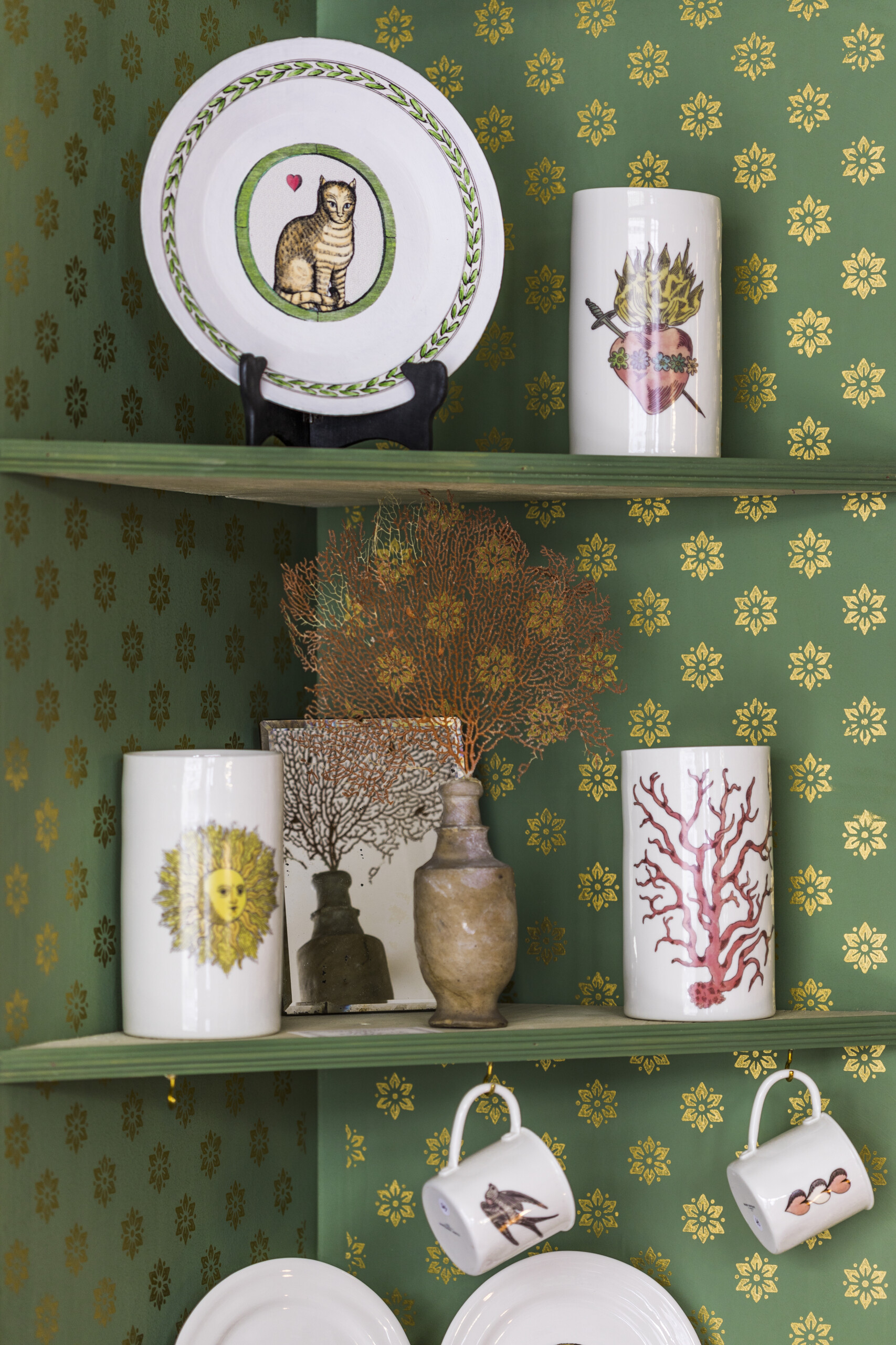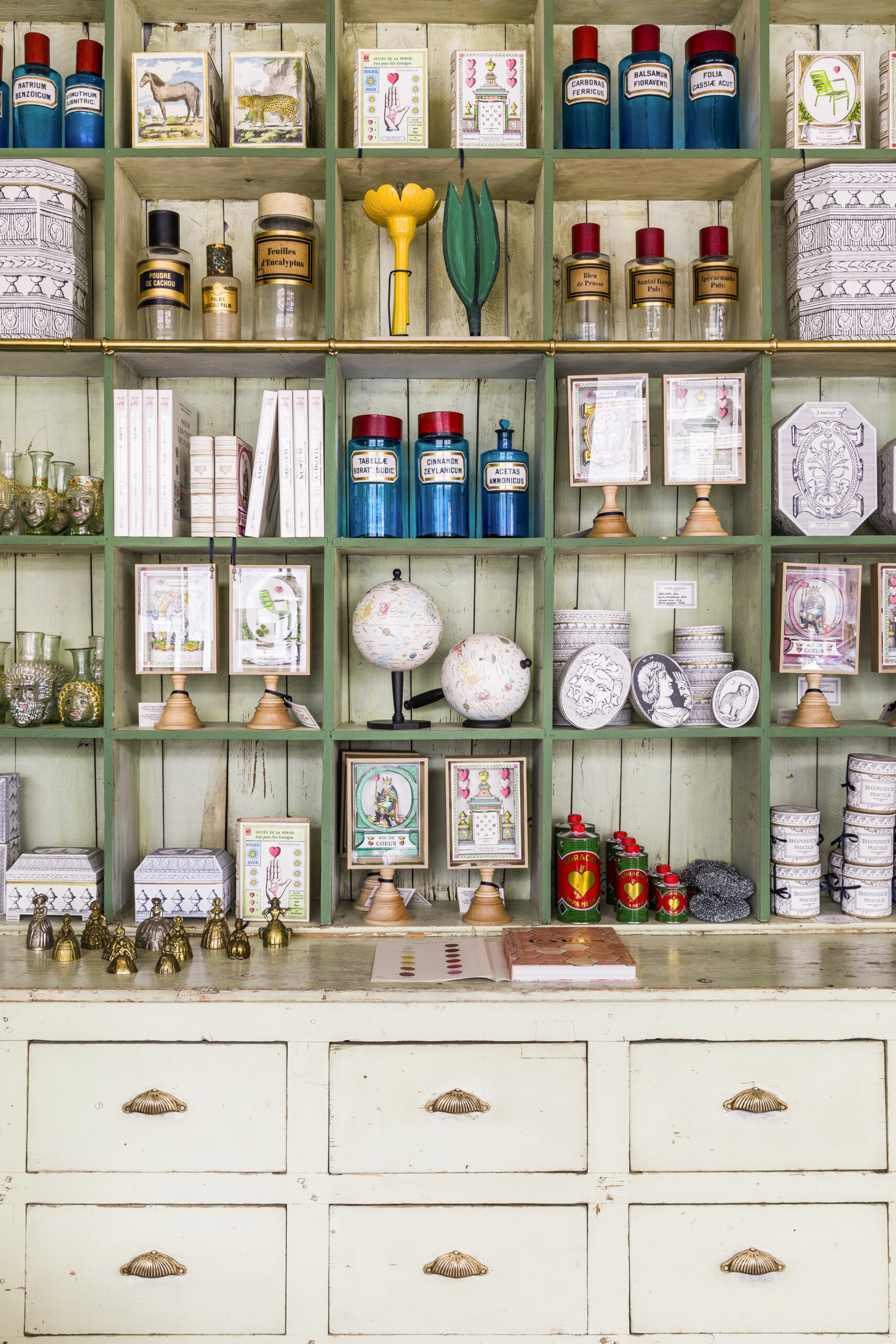 Théâtrale. Les étagères scénographiées comme un cabinet de curiosités : objets chinés et créations maison dialoguent en silence. © Romain Ricard Flânerie. Dans la boutique, pleine de couleurs, la décoration est orchestrée comme une mise en scène personnelle, entre maison de famille et galerie d’art populaire. © Romain Ricard