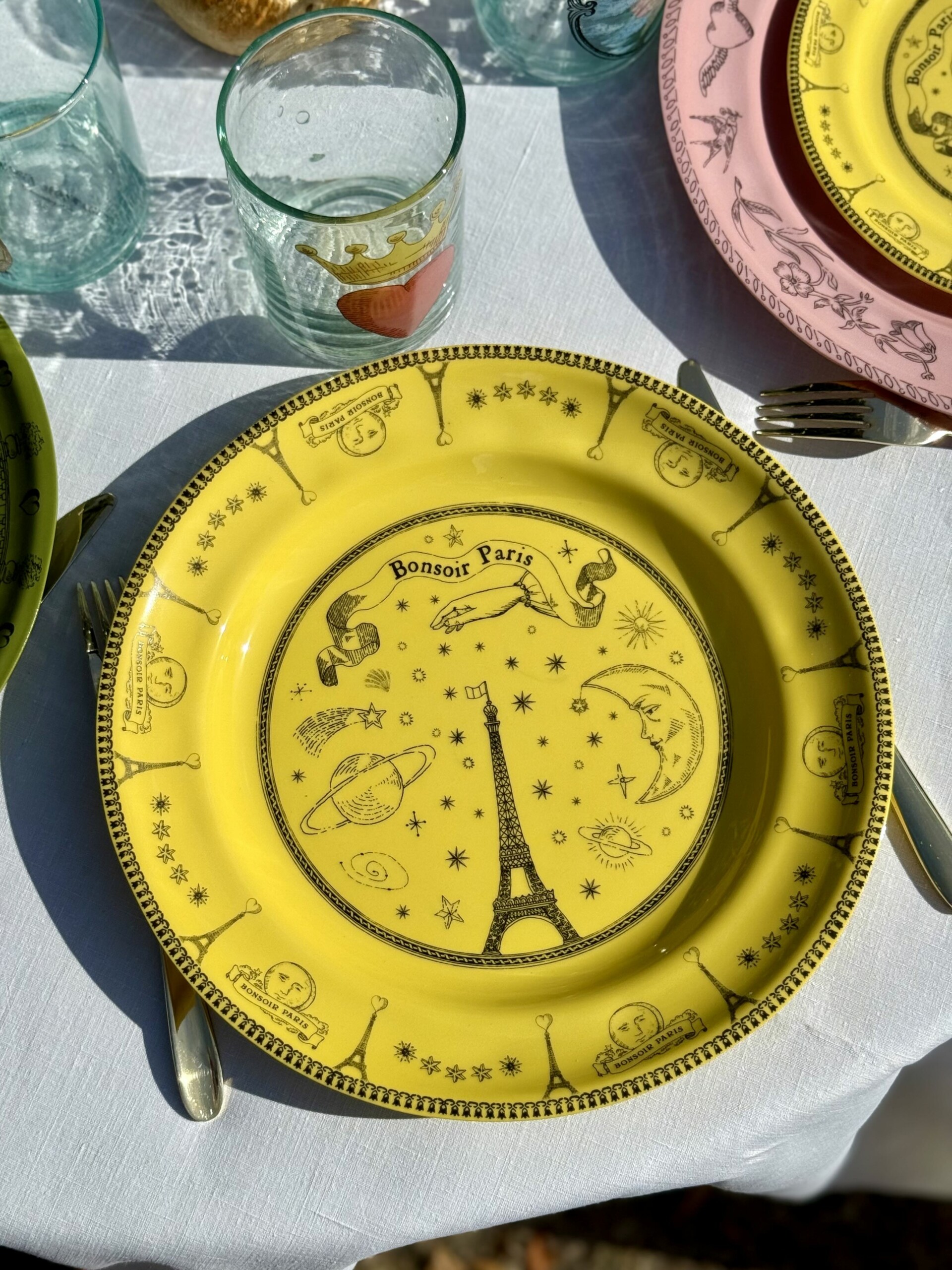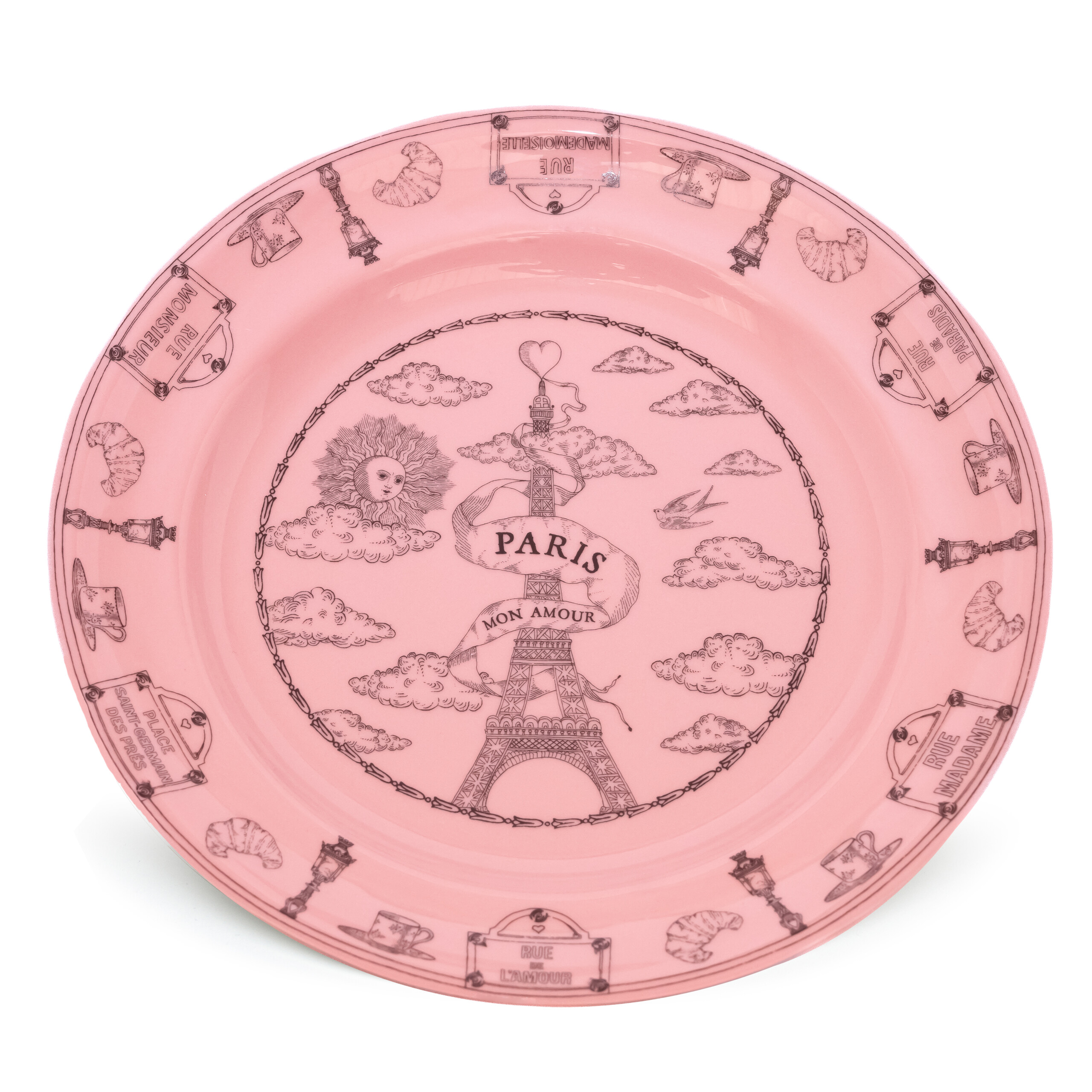 Patrimonial. Le Jardin du Luxembourg, dans sa version « assiette parlante ». Cette série d’assiettes est un clin d’œil aux assiettes parlantes du XIXe siècle, objets populaires à message, que Marin Montagut réinvente avec poésie. Romantique. « Paris mon amour » : une déclaration illustrée en lettres fines. Chaque pièce en porcelaine émaillée est unique.