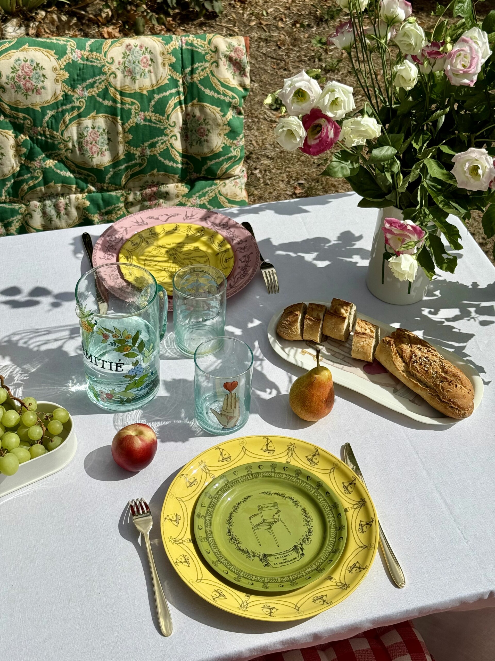 Heureux. Table joyeusement dépareillée, entre camaïeux et croquis délicats : les assiettes parlantes invitent à composer son propre poème de table.
