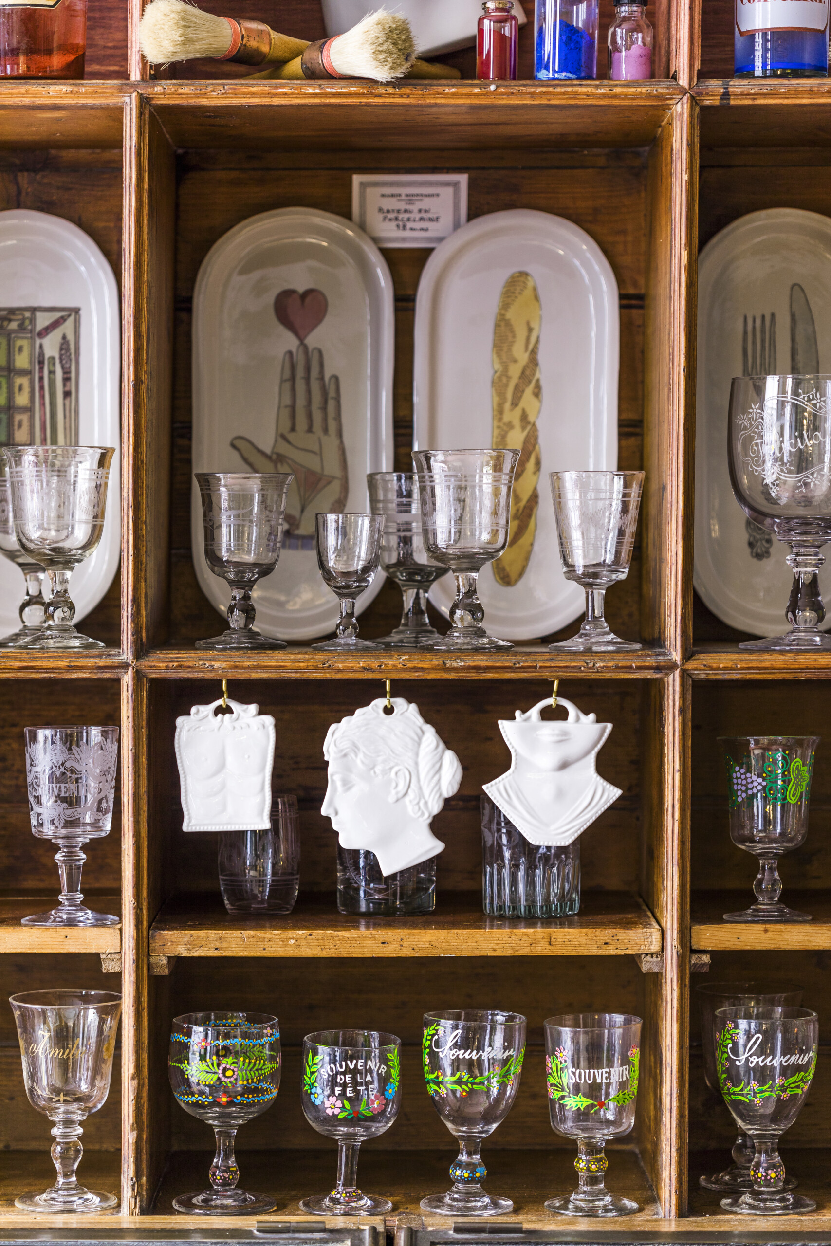 Cristalline. La verrerie, aux lignes douces, cultive l’art du quotidien avec raffinement. © Romain Ricard Totémique. Le chat malicieux veille sur ce coin de boutique comme un totem discret. © Romain Ricard
