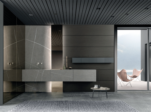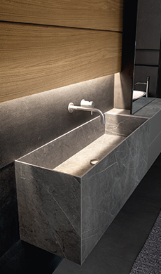 Salle de bains Skill Gres de Modulnova. Le lavabo suspendu en grès Senda (solid surface) contraste avec le chêne gris fumé des panneaux de boiserie et souligne la structure horizontale de l’ensemble. modulnova.com