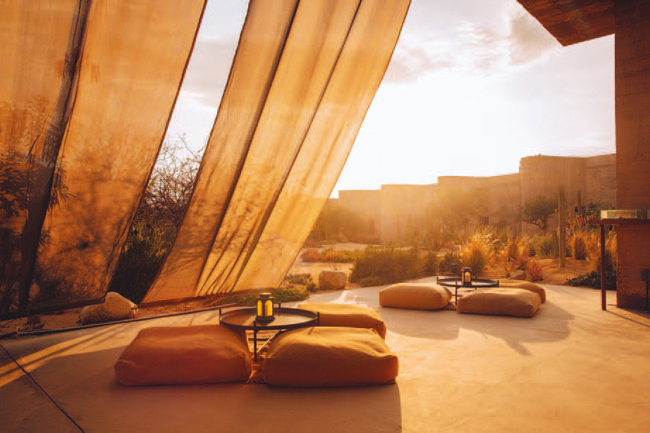 PAUSE. La piscine de 40 mètres s’ouvre sur un horizon infini de cactus et de palmiers. Le Living Room, coeur de l’hôtel, se drape de rideaux flottants et canapés cosy.