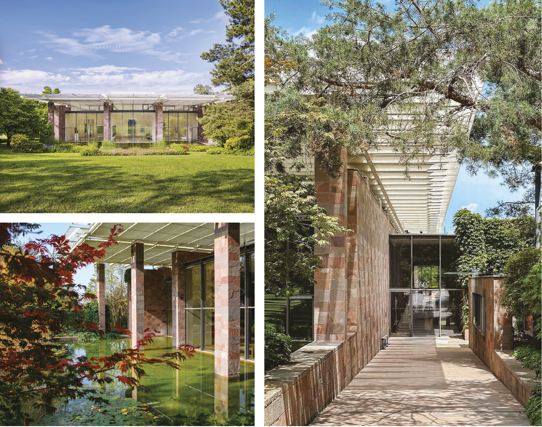 Dans le parc Berower, entre les vignes de Riehen et les lisières de la Forêt-Noire, le musée d’art moderne et contemporain de la Fondation Beyeler se fond dans le paysage. Imaginé par l’architecte Renzo Piano en 1997, ce volume longiligne s’efface presque derrière les arbres centenaires et les prés vallonnés. Pourtant, ce qui accroche le regard, c’est sa matière : le porphyre rouge de Patagonie. Cette pierre volcanique dense, rugueuse, d’un rouge profond, confère au bâtiment un caractère tellurique. Son grain rugueux, ses nuances brunes et pourpres lui donnent la patine d’un édifice ancien, comme si le musée avait toujours été là. À cette massivité minérale, l’architecte a ajouté un toit de verre qui capte la lumière du nord : un contraste entre ancrage et légèreté, entre matière et lumière. Bientôt, l’ensemble s’enrichira d’une extension conçue par Peter Zumthor : trois volumes sobres, en béton de calcaire du Jura, viendront s’insérer dans le parc élargi ; une nouvelle strate d’architecture, plus proche encore de la terre.