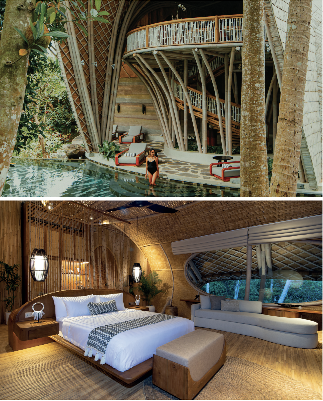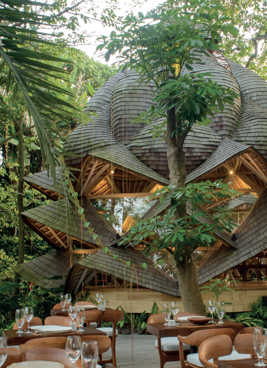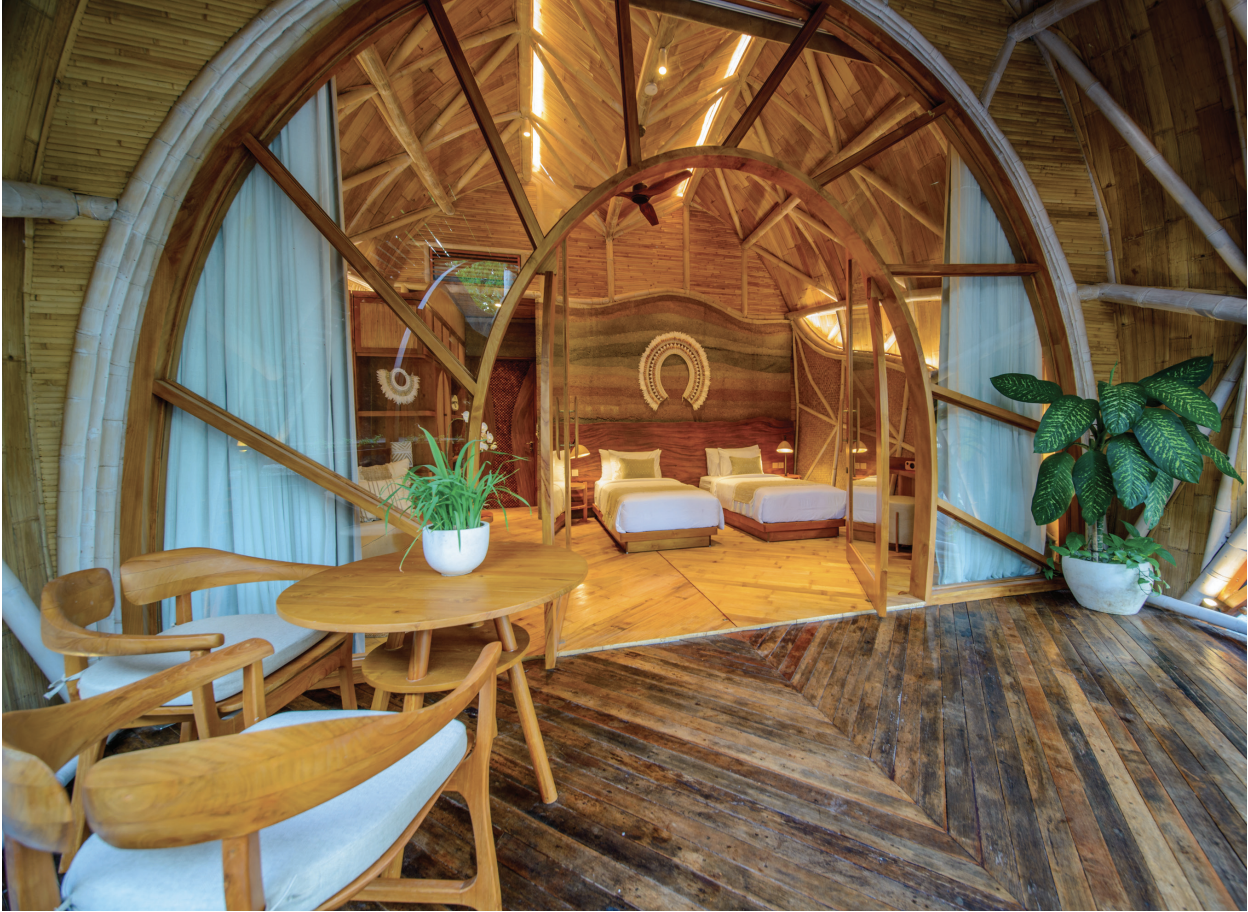 MAJESTUEUX. Du bâtiment principal en forme de cocon, au grand escalier en bambou, en passant par l’intérieur des chambres, chaque détail suscite la contemplation.