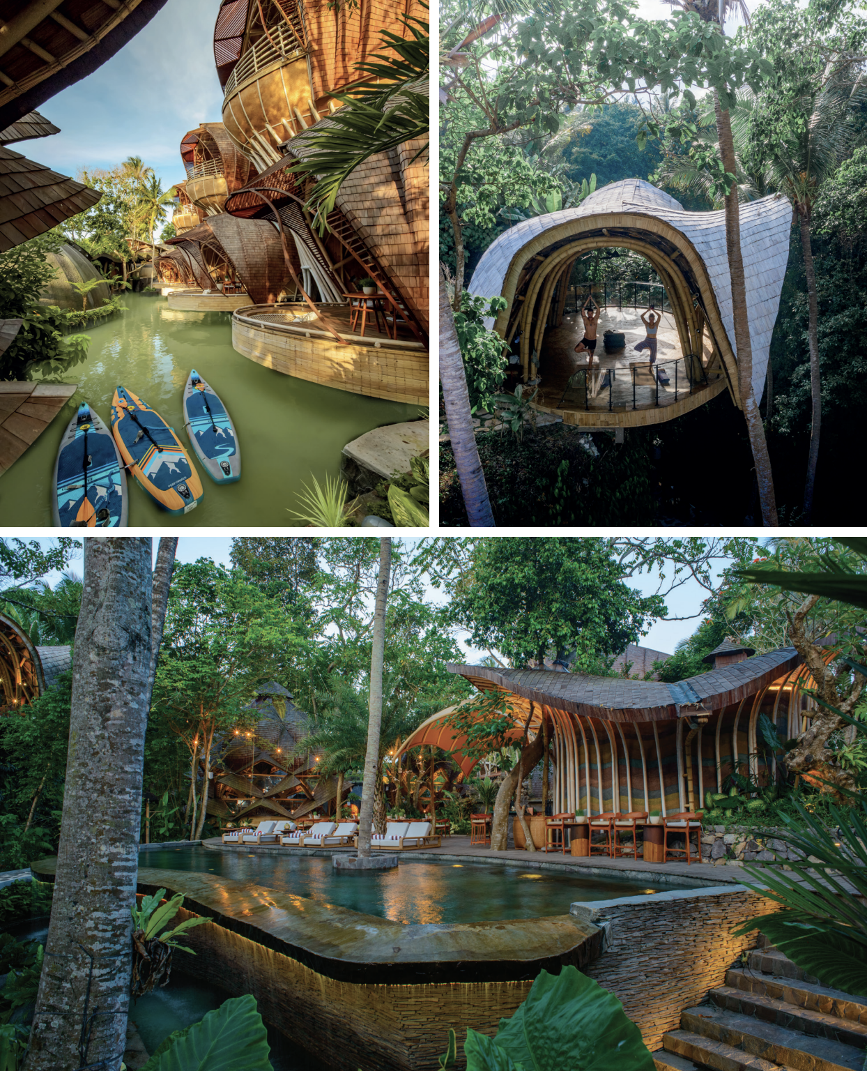 Dès le premier regard, l’architecture envoûtante d’Ulaman séduit par ses courbes aériennes et ses structures en bambou, tel un chefd’œuvre sculpté par la nature ellemême. Les bâtiments, façonnés avec des matériaux locaux, comme la terre battue et la chaux, se fondent totalement dans le paysage. Chaque hébergement a été pensé pour fusionner avec la beauté naturelle du site : les Lake Villas, élégantes et flottantes, offrent un accès direct à un lac biofiltré où évoluent paisiblement des poissons koï. Avec leurs baignoires en teck et leurs vastes baies vitrées, elles invitent à une détente immersive. Perchées à neuf mètres au-dessus du sol et accessibles par un tunnel en bambou, les Sky Villas dévoilent une vue époustouflante à 180° sur la jungle luxuriante et les rizières alentour. Véritable joyau du complexe, la Grande Villa Exclusive surplombe la lagune et déploie un espace somptueux avec piscine privée, grande terrasse et salon ouvert sur la végétation. En adoptant le concept «de la ferme à la table», le restaurant E.A.R.T.H privilégie des produits frais et locaux, garantissant une cuisine à la fois savoureuse et respectueuse de l’environnement. Avec une approche créative, le chef Arik sublime les ingrédients du terroir et décline son expertise à travers une cuisine balinaise traditionnelle et des saveurs du monde. Pour une parenthèse de relaxation, Ulaman Eco Retreat propose des soins revitalisants au sein de son Spa Riverside, un écrin de sérénité absolue. Son dôme abrite des salles de massage raffinées, des bassins chauds et froids, ainsi qu’un sauna infrarouge, offrant une expérience sensorielle unique au rythme apaisant de la rivière. L’engagement environnemental de l’hôtel se traduit par des pratiques durables exemplaires : énergie solaire, politique zéro plastique, jardins biologiques ou encore, un système de filtration d’eau puisée directement sur place. Séjourner à Ulaman, c’est embrasser une philosophie de vie où le luxe se conjugue avec la nature, où l’innovation architecturale sublime la tradition, et où chaque instant invite au ressourcement.