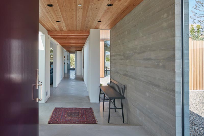 L’agence MDA a collaboré avec des paysagistes pour conserver les séquoias et les chênes existants, ainsi que pour planter une petite oliveraie. Selon les architectes, « la présence des oliviers et l’absence de clôture sur la propriété et les parcelles voisines ouvrent les horizons et donnent l’impression que chacun prête sont espace à l’autre. » Bien que située en banlieue sur un terrain de 4000m2, ce ranch moderne est invisible de la rue. La maison offre ainsi aux occupants un refuge enfoui dans la nature. Un abri calme, bien loin de l’effervescente Silicon Valley qui se trouve pourtant à quelques encablures.